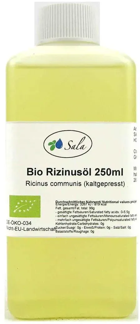 Kategorie: Haarkuren - Hexin - PREMIUMQUALITäT: Rizinusöl 60 ml, 100% Bio, Rein, Natürlich und Kaltgepresst. RIZINUSöL HAARE fantastische nährstoffe beschleunigt das natürliche wachstum, kann tief eindringen und brüchiges haar von innen reparieren, reduziert spliss und macht Ihr haar glatter und glänzender. CASTOR OIL ORGANIC, reich an vitamin e und omega-6-fettsäuren, hilft auf natürliche weise, die haut zu erweichen und zu befeuchten, kleine fältchen zu glätten, abgestorbene hautzellen zu entfernen. HAAR UND WIMPERN: Kaltgepresstes rizinusöl für haare bietet reichhaltige pflege für wimpern und augenbrauen, Hilft bei der stärkung und verdickung der augenbrauen und wimpern. NäGEL: Rizinusöl ist hilfreich im Umgang mit beschädigten und brüchigen Nägeln. Eine regelmäßige Anwendung trägt zur Stärkung der Nägel bei und fördert das Nagelwachstum. Eine KOSTENLOSE PIPETTE wird jeder ölflasche beigefügt, um die Anwendung zu erleichtern. Unser Rizinusöl ist in einer braunen (dunklen) Glasflasche verpackt, um eine ideale Konservierung fern von Licht und eine Verhinderung von Oxidation zu gewährleisten. - 5,99 Euro bei Amazon Marketplace Beauty - gefunden von billiger.de ![]() ![]() Sala Rizinusöl kaltgepresst BIO 250 ml PET Flasche