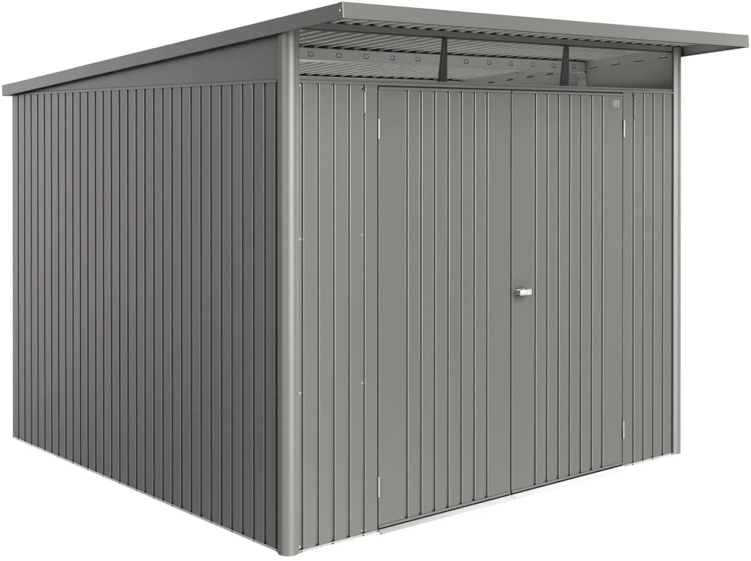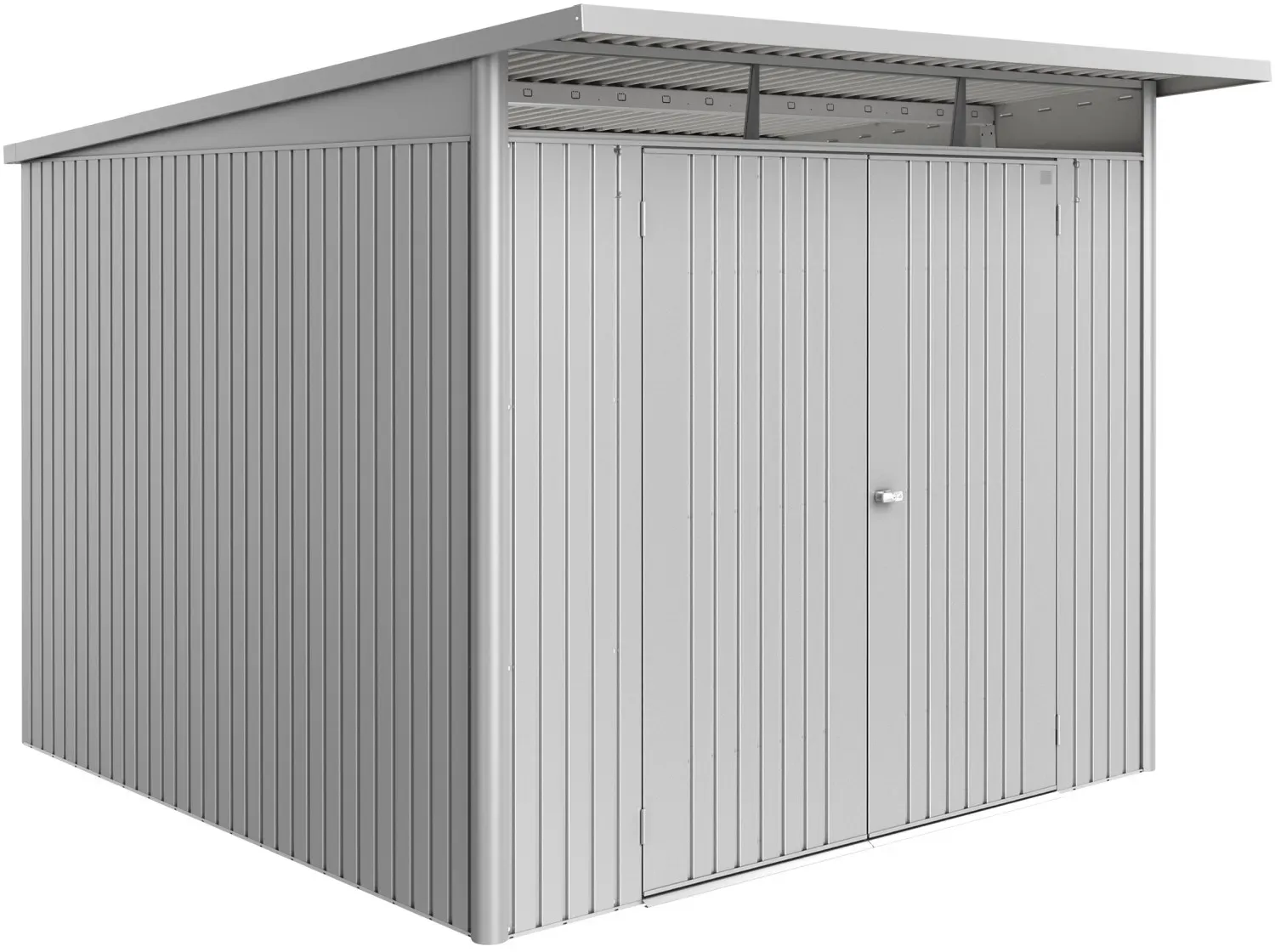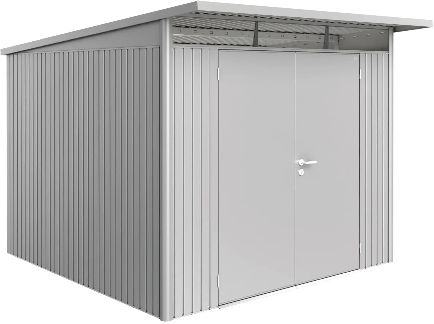Verfügbarkeit: 12 Tage - Kategorie: Gartenhäuser - Biohort - GTIN:9003414250598 - Das Biohort Metall-Gerätehaus AvantGarde in der Größe A7 bietet einen praktischen Lagerraum und erfüllt dabei höchste Ansprüche in Design und Funktionalität. Das Gartenhaus überzeugt durch sein modernes und schlichtes Design und ist alles andere als ein langweiliges Gerätehaus. Die hochwertige Verarbeitung und die herausragende Qualität der verwendeten Materialien machen das Metall-Gerätehaus zu einem Gartenhaus der Extraklasse. Hochwertige Verarbeitung und zeitloses Design Die Wände des Gerätehauses sind aus feuerverzinktem und in Silber-Metallic lackiertem Stahlblech gefertigt. Die verwendeten Materialien zeichnen sich durch ihre hohe Stabilität und ihre ausgesprochen lange Haltbarkeit aus. Die Doppeltür des Gerätehauses verfügt über eine 3-fach-Verriegelung mit Normzylindern, die das Gartenhaus zu einem sicheren Aufbewahrungsort macht. Im Lieferumfang sind zwei Schlüssel enthalten. Die Tür ist stabil und lässt sich durch die verbaute Gasdruckfeder besonders leicht öffnen und schließen. Außerdem hält die Gasdruckfeder die Tür zuverlässig in geöffneter Position und ein Zufallen der Tür wird verhindert. Für eine optimale Funktionalität ist der Einbau der Tür auch in der Seitenwand möglich. Stabiles Satteldach mit integrierten Oberlichtern Der Gartenschuppen ist mit einem stabilen Satteldach ausgestattet, das jeder Witterung standhält. Es ist für eine ... Eine weitere Option mit Einzeltür in silber-metallic, die Funktionalität und Ästhetik vereint. ![]() ![]() Biohort Gerätehaus Avantgarde mit Einzeltür 260 x 300 cm (Gr. A7 - alte Größe XL) Edelstahl-Drückergarnitur silber-metallic