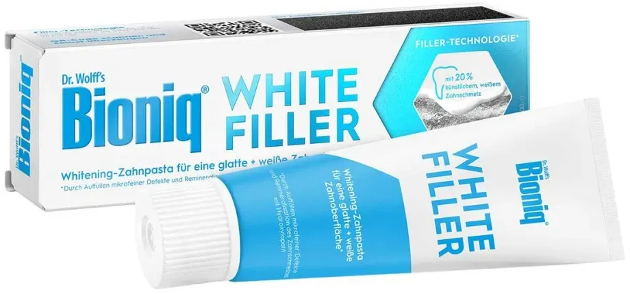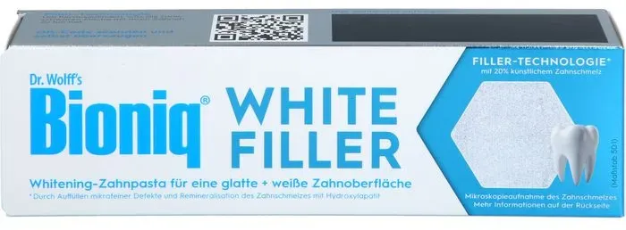 Beliebtheit und MarktpositionDie Bioniq® White Filler Zahnpasta ist eine Nischenmarke, die gezielt auf sanftes, schmelzschonendes Whitening setzt. Sie richtet sich an Verbraucher, die Wert auf schonende Zahnaufhellung und Zahnschmelzschutz legen. Im Vergleich zu großen Marken wie Colgate, Oral-B oder Sensodyne ist sie weniger bekannt, aber bei zahnbewussten Nutzern beliebt, die auf innovative Inhaltsstoffe wie Hydroxylapatit achten. Die Zahnpasta wird häufig in Apotheken, Drogeriemärkten (z.?B. Rossmann, dm) und Online-Shops angeboten[3][5]. Preisbereich und PreisvergleichDie Bioniq® White Filler Zahnpasta (75?ml) ist im Preisvergleich ab etwa 6,39?€ bis 9,45?€ erhältlich, wobei die meisten Angebote zwischen 7,97?€ und 8,99?€ liegen2][4]. Der Preis kann je nach Anbieter und Aktion leicht variieren. Für den günstigsten Einkauf empfiehlt sich ein Meta-Preisvergleich, z.?B. über [Bioniq White Filler Zahnpasta. Worauf sollten Sie beim Kauf achten?