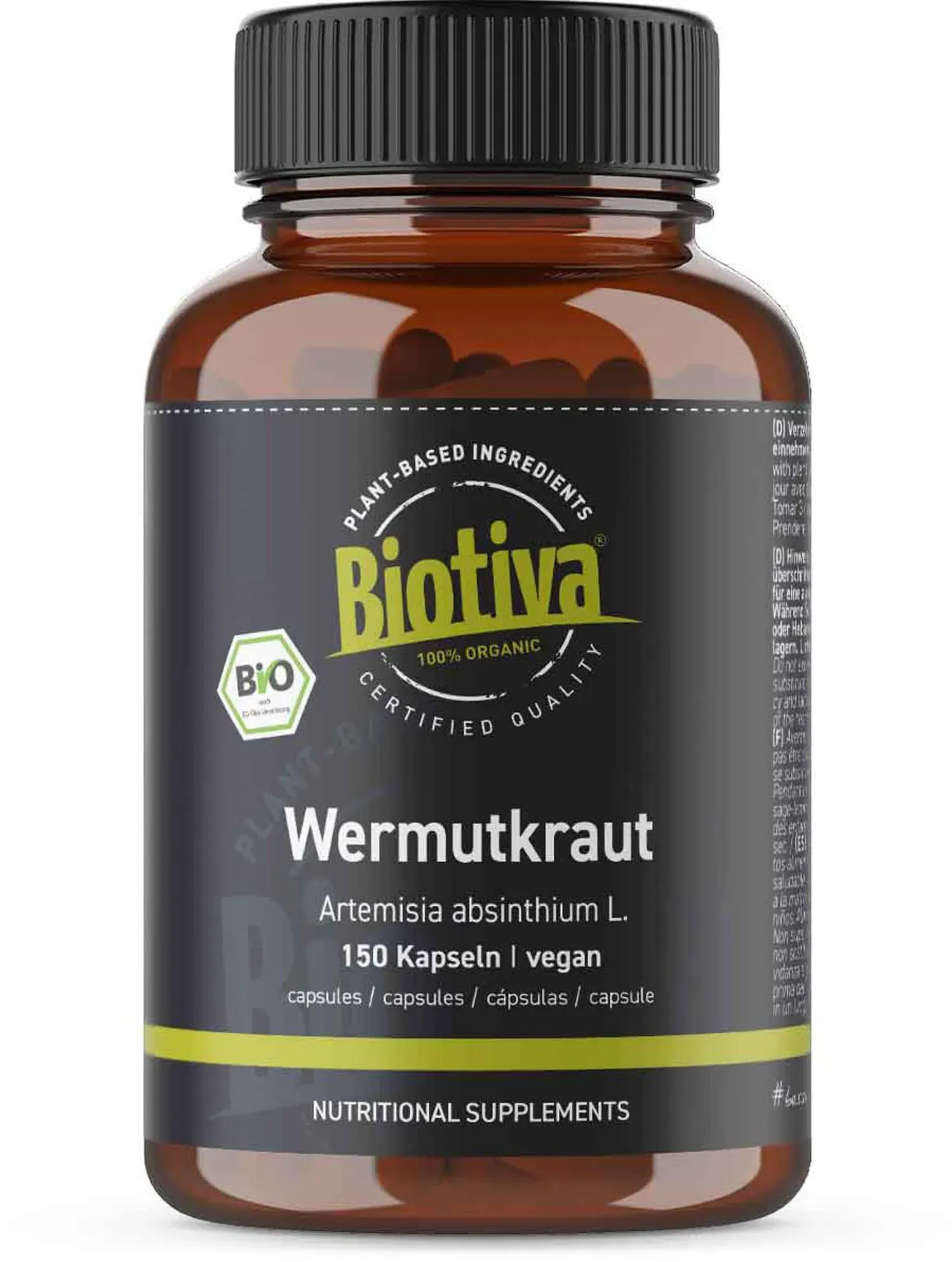 Auf Lager Versand durch AmazonBiotiva Wermutkraut Kapseln Bio 150 Stück - 400mg - Wermut - Garantiert ohne Zusatzstoffe - Abgefüllt und kontrolliert in Deutschland (DE-ÖKO-005)