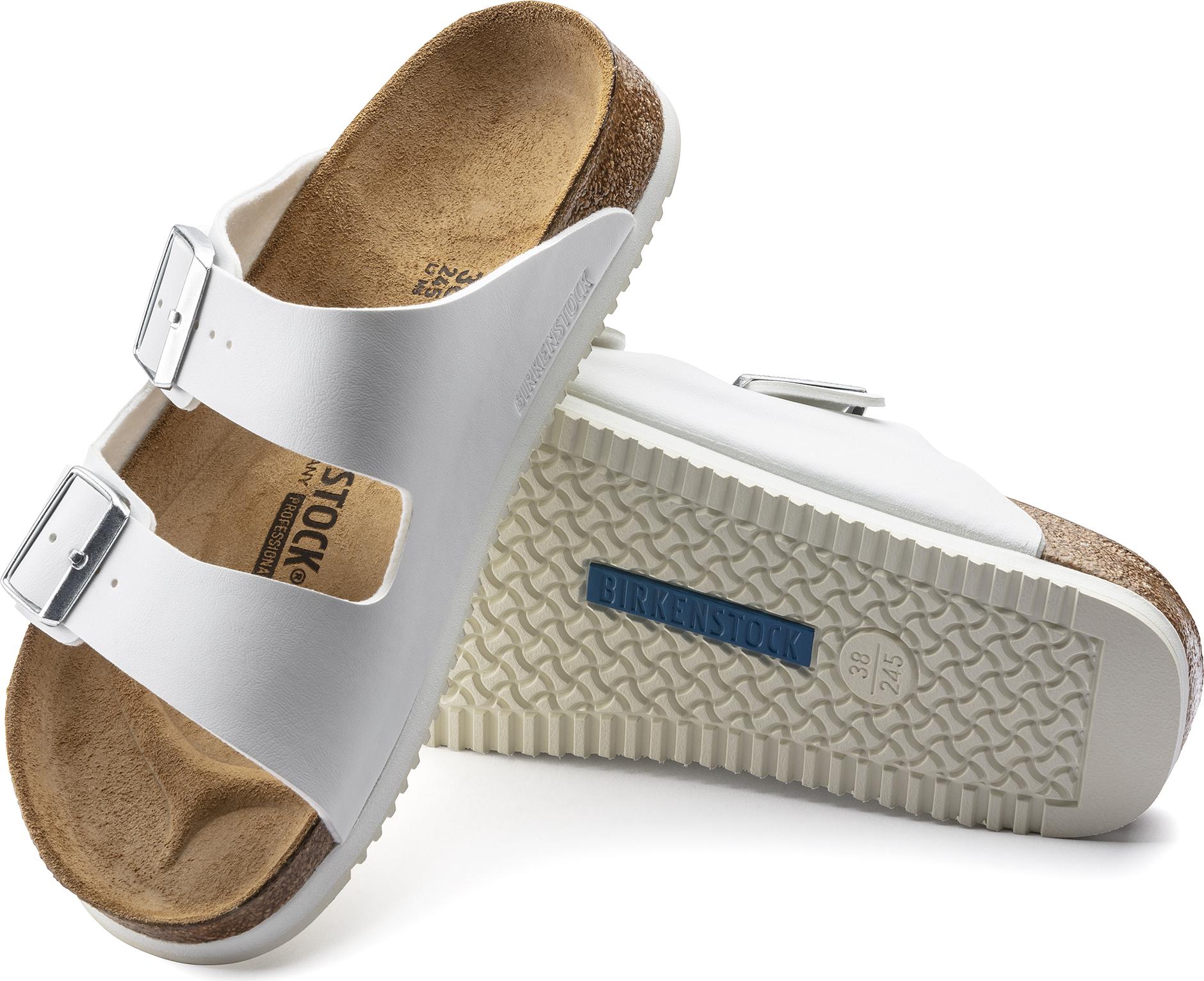 Zustand: Neu - Slides Slides für Damen - Birkenstock - 4052001429737 230114 - EAN: 4052001429737 - anatomisch geformtes Kork-Latex-Fußbett dämpfende EVA-Zwischensohle rutschhemmende öl- und fettbeständige Gummilaufsohle Birko-Flor besteht aus einem pflegeleichten und hygienischen PVC?Kunststoff, der an der Innenseite mit einer weichen, atmungsaktiven Schicht aus Vlies verbunden wurde dank der individuell verstellbaren Riemen mit Dornschließen aus Metall bietet die Sandale außergewöhnlich guten Halt und Tragekomfort die hautfreundliche, flexible Leder-Decksohle schmiegt sich sanft an den Fuß und passt sich an dessen Kontur an offenporige und dadurch besonders atmungsaktive Oberfläche ermöglicht auch bei starker körperlicher Aktivität ein angenehmes Fußklima besonders tiefe Ausformung im Fersenbereich stützt das Fußgewebe und hält das Fersenbein stabil in seiner natürlichen Position - für einen nahezu ähnlich starken Halt wie in einem geschlossenen Schuh Fersenbar aktiviert die Wadenmuskulatur, stabilisiert den Rückfuß und verbessert Schrittführung und Koordination innere und äußere Längsgewölbestützen verleihen dem Fuß beim Auftreten die nötige Stabilität - 4 Händler im amazon.de Marketplace ![]() ![]() Birkenstock Professional Arizona Prof schwarz normale Weite Sandale 37 EU