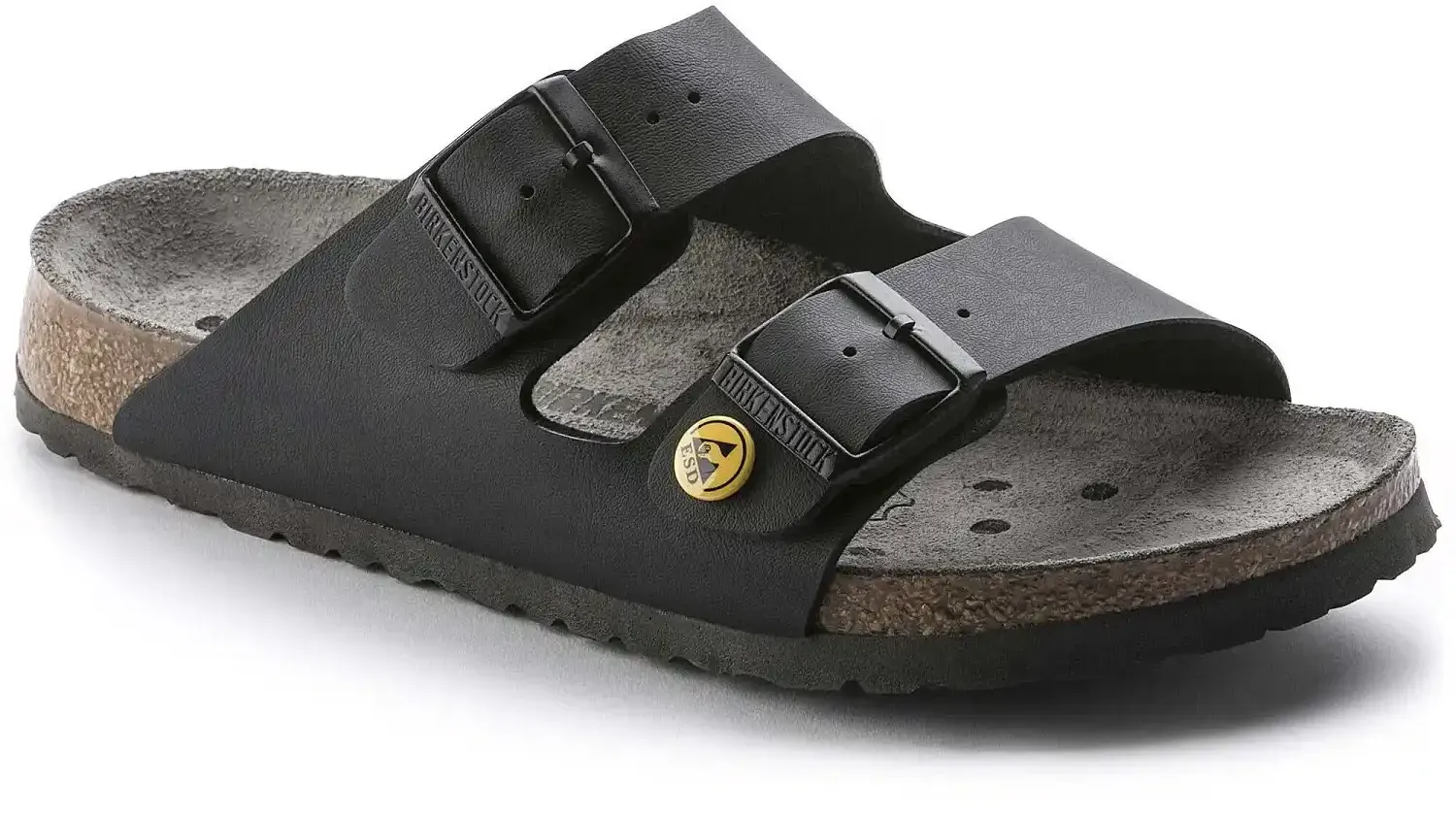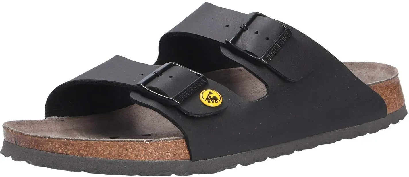 Kategorie: Arbeits- & Schutzkleidung - Birkenstock - GTIN:4052001199272 - ESD-gerecht nach EN 61340 anatomisch geformtes Kork-Latex-Fußbett Fersenriemen-Sandale mit drei individuell verstellbaren Dornschnallen aus Metall Absatzform Nullstellung zwei Schuhweiten (normal/schmal) - 66,45 Euro bei Amazon Marketplace Shoes - gefunden von billiger.de Die Arizona ESD in schmaler Ausführung für 67.94 Euro ist ein beliebtes Modell und hier zu einem fairen Preis erhältlich. ![]() ![]() Birkenstock ESD-Sandale Arizona, Größe 39, schwarz, schmal 089428-39 (Alpro Arizona Birki Halbschuh Latsche Pantolette Sandale Sandalette Schlappe Schlappen Schluffen Schuh Schuhe Treter) - 39 EU