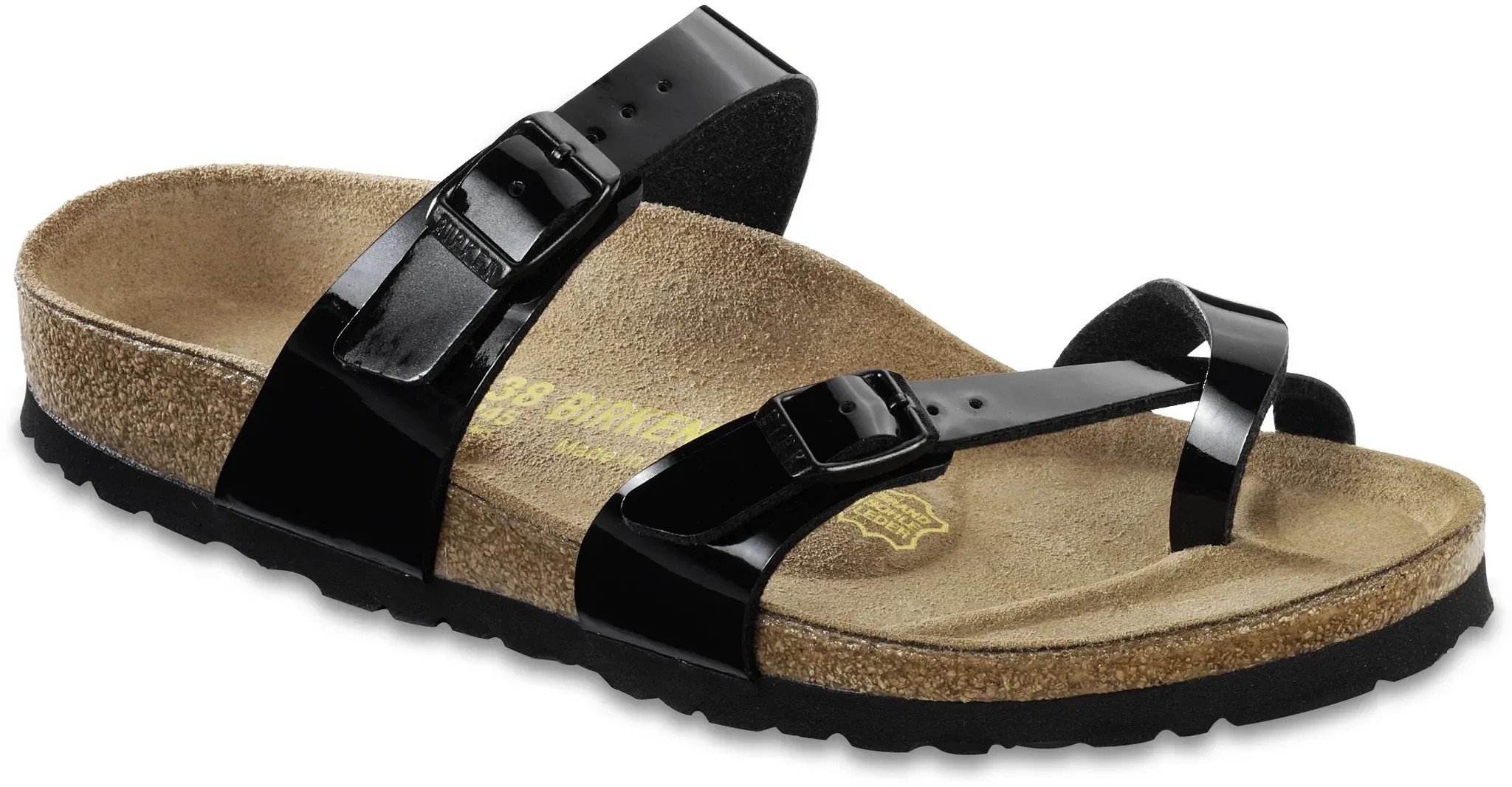 Sandalen Damen Schuhe~~Sandalen~~Flache Sandalen - Schuhe von Birkenstock Befreie deine Füße Zum Überziehen Klassisches Birkenstock-Design Offene Zehenpartie mit erhöhten Einbuchtungen zur Unterstützung der Abrollbewegung des Fußes Vorgeformtes Fußbett aus Kork, das sich im Laufe der Zeit der Fußform anpasst Deutliche Mittelfußstütze für noch mehr Stabilität Elastische EVA-Sohle sorgt für leichte Polsterung und Stoßdämpfung Dieses Modell hat eine schmale Passform - gefunden von Kelkoo Die Birkenstock Mayari ist ein eleganter Zehentrenner mit schmalen Riemen, der eine feminine Alternative bietet. ![]() ![]() Birkenstock Damenschuhe 71093 Mayari Damen Zehentrenner, Sandalen, Schwarz (Black), 40 EU - 40 EU