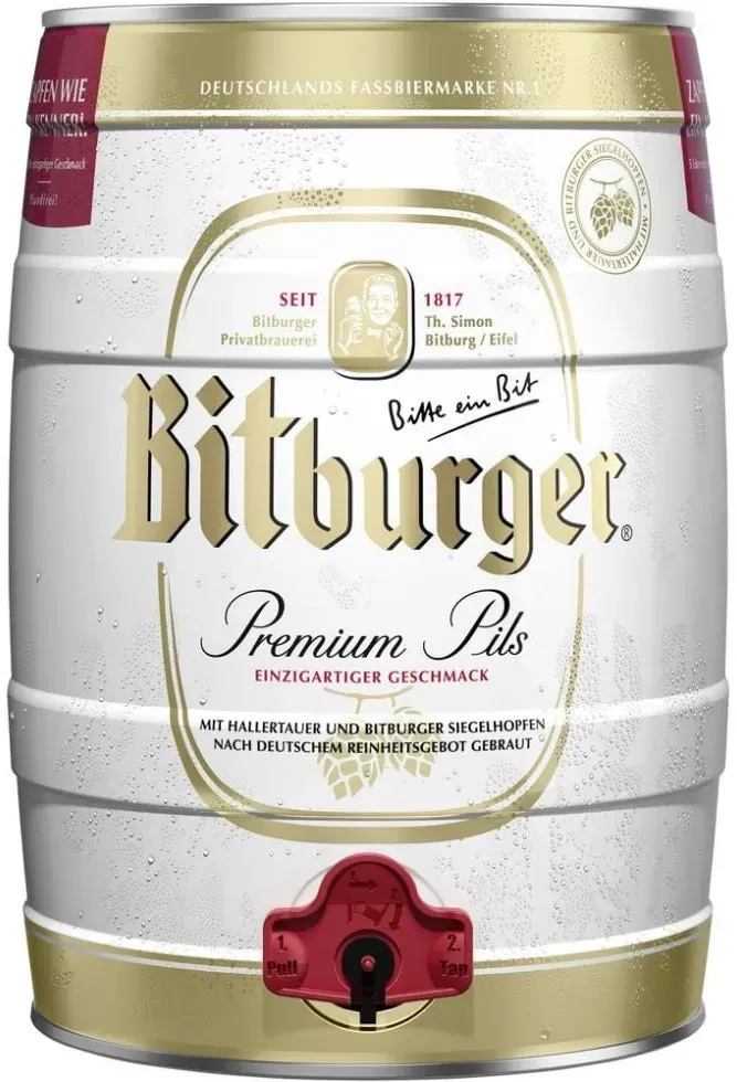 Zustand: Neu - 5,05 € / l - Pils Pilsner Bier - Bitburger - 3124B - EAN: 4102430312404 EAN: 4102430312411 - 0,0% Alkohol Isotonisch Vitaminhaltig Glasflasche - 1 Händler im amazon.de Marketplace Das 5-Liter-Partyfass ist perfekt für Feiern oder gesellige Runden und bietet frisches Bitburger Pils vom Fass. ![]() ![]() Bitburger Bier Premium Pils 5 l Party-Fass mit Zapfhahn