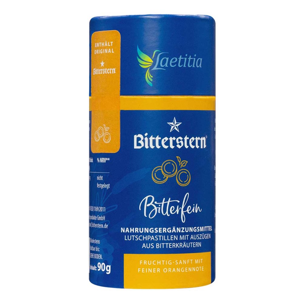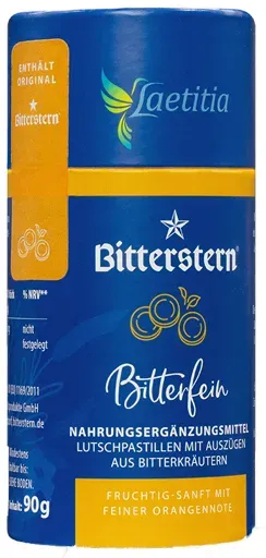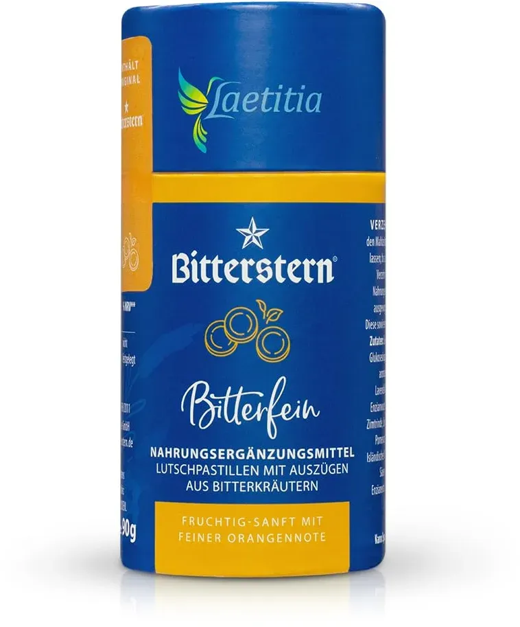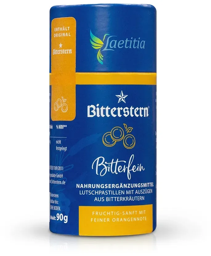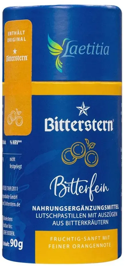 Bitterfein - EAN: 9120072391262 - PZN: 19301307 Bitterfein Kräuterbitter Pulvermischung 50 g - bei volksversand.de - aus Yadore Produktdaten Dieses Angebot bietet die Laetitia Original Bitterstern Lutschpastillen mit Orangennote, eine geschmacklich ansprechendere Variante der Bitterstoffe. ![]() ![]() Laetitia Original Bitterstern Lutschpastillen Bitterfein: Bitterstoffe aus 17 natürlichen Kräutern in bester Qualität mit feiner Orangennote zum Lutschen, Alternative zu Bittertropfen, vegan, 90g