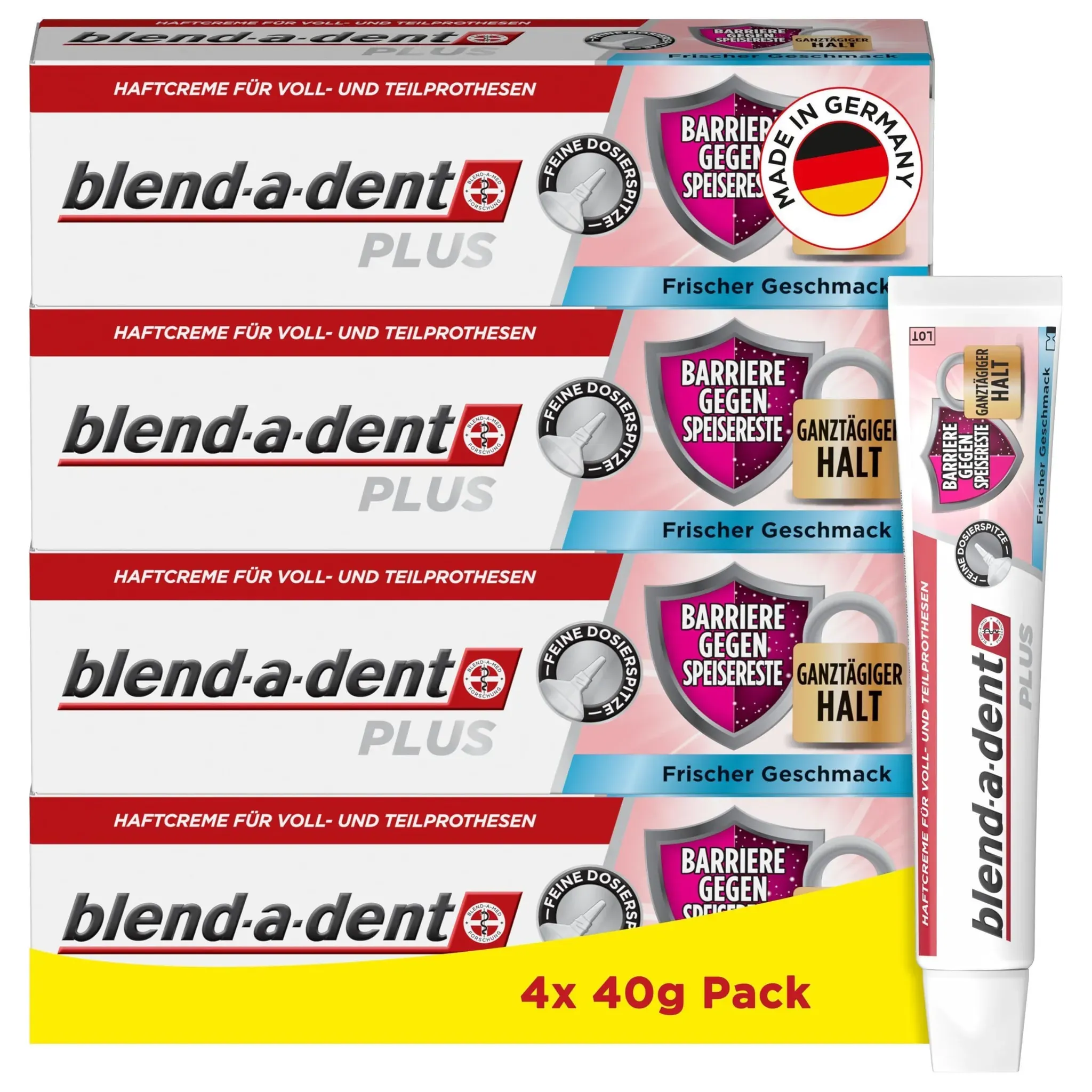 Auf Lager Versand durch AmazonBlend-a-dent Plus Barriere Gegen Speisereste Premium Haftcreme, für Voll- und Teilprothesen, Geschmacksneutral, Made in Germany, 4x 40g Pack,Weiss