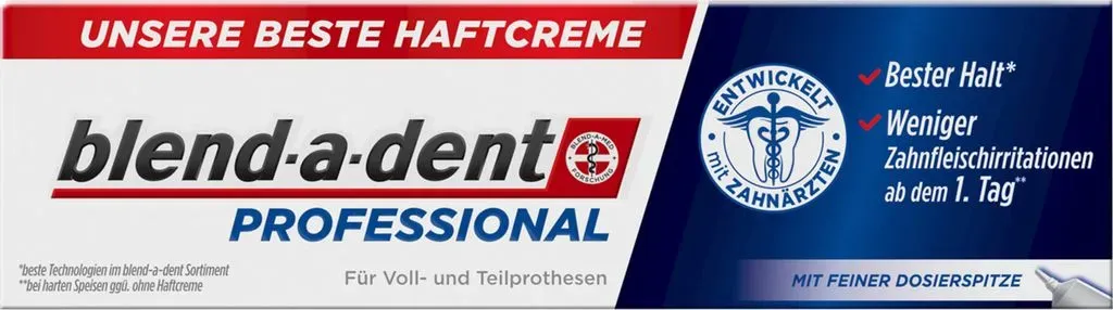 2 Händlerangebote bei billiger.de - Kategorie: Zahnpflegeartikel - blend-a-dent - BLEND A DENT Professional Haftcreme - GTIN:8006540315071 - PZN:17668742 ![]() ![]() Blend-a-dent Professional, unsere beste Haftcreme, für Voll- und Teilprothesen, 40g