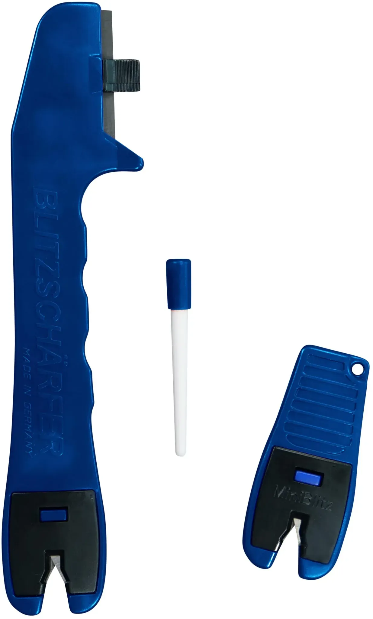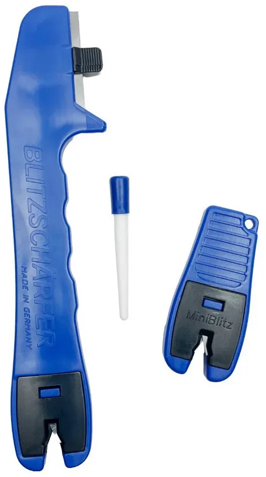 ![]() ![]() BLITZSCHÄRFER MADE IN GERMANY BLITZSCHäRFER MADE IN GERMANY Messerschärfer Set 3 tlg. Messerschleifer Scherenschleifer manuell tragbar, Hochwertige 4-fach wendbare Schärfeinsätze aus Hartmetall blau