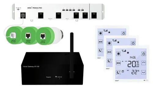 Verfügbarkeit: 2-3 Werktage - Kategorie: Fußbodenheizungen - blossom-ic - GTIN:4260356850537 - ' blossom-ic Hera+ Primus PRO Tres Set Steuerung Fußbodenheizung per Funk bestehend aus: 3x Hera+ Thermostat (HPT-3975) 3x Hera+ Actor Stellantrieb (HAC-3974) 1x Hera+ Primus PRO (HPPR-4020) 1x Gateway GT-100 (GS-3996) Zur Einzelraumregelung der Fußbodenheizung mit Raumthermostaten (Batterie und 230V) Funk-Fußbodenheizungsleisten, eigenen blossom-ic Stellantrieben mit Schrittmotoren und Rücklauftemperaturfühlern Nur einsetzbar in Verbindung mit Gateway GT-100 Bedienung am Raumthermostat und über blossomic App möglich Einfache Installation und Bedienung. Mit digitalem hydraulischen AbgleichStarter-Kit Blossom-ic Hera+ Thermostat HPT-3975 Funk-Raumthermostat zur Verwendung in Kombination mit der Hera+ Primus/Hera+ Extensia Funk-Fußbodenheizungsleiste und den Hera+ Actoren. Mit einem Funk-Raumthermostat können bis zu 150 Actoren über die Funk-Fußbodenheizungsleiste gesteuert werden. Raumtemperatur Anzeige direkt am Thermostat. Thermostat ist mit Bewegungssensoren ausgestattet. Moderne Touchscreen Technologie. Beleuchtetes Display. Batterie Ausführung, 4 x Mignon AAA 1.5V. Mit Fensteröffnungserkennung. In Verbindung mit GT-100 Gateway. Selbst bei Internetausfall kommunizieren die Thermostate untereinander weiter, lediglich die Steuerung über die App ist nicht möglich. Einfach und bequem zu bedienen und zu installieren. Steuerung am Thermostat oder über die ... Ein umfangreiches Starter Kit für Fußbodenheizungen, das eine komplette Steuerungslösung bietet. ![]() ![]() Blossom-ic Starter - Kit Hera+ eBay Primus PRO Tres HPPS-4070 für Fußbodenheizung