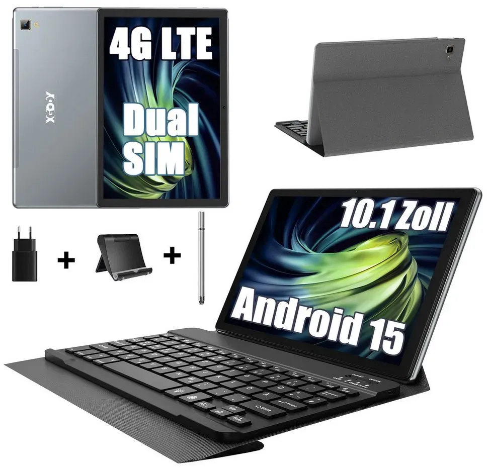 lieferbar-in 2-3 Werktagen bei dirXGODY Android 15 24GB+256GB 10.1 Zoll 4G LTE 2SIM Tablet Smartphone (25,65 cm/10.1 Zoll, 256 GB Speicherplatz, 13 MP Kamera, Kostenlose Bluetooth-Tastatur, Tablet-Hülle, Ladegerät, Stift) grau