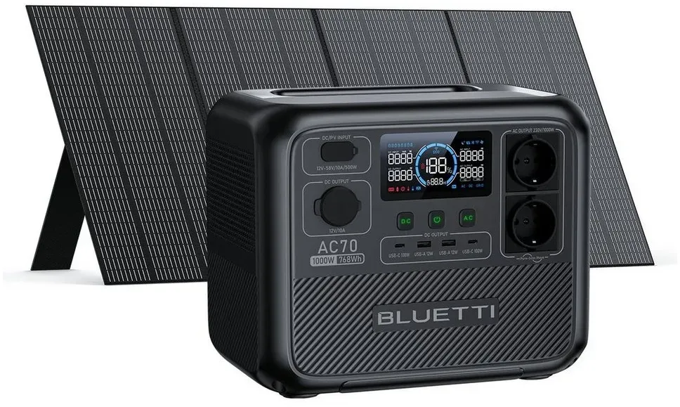 2 Händlerangebote bei billiger.de - Kategorie: Solaranlagen - Bluetti - Produktdetails Art Generator , Gleichstrom Wechselstrom, Funktionen , AC70+PV350, Anzahl Steckdosen 230V , 2 St., Anzahl Steckdosen 12V , 1 St., Anzahl Anschlüsse , 7 St., Technische Daten Art Motor , elektrische Energie Solar Energie, Art Kraftstoff , elektrische Energie Solar Energie, Art Anlasser , Elektrostart, Ausgangsspannung , 220-240V V, Motorleistung maximal in kW , 1,00 kW, Nennstrom bei 12V , 10,00 A, Frequenz , 50Hz Hz, WEEE-Reg.-Nr. DE , 28786433, Maße & Gewicht Gewicht , 10,20 kg, Hinweise Hersteller , 5 jagre-AC70; -Solar panel, Sprachen Bedienungs-/Aufbauanleitung , Deutsch, Product Compliance Nettofüllmenge (Gewicht) , 10200,00 g, Stromversorgung Typ Netzstecker , AC/DC/USB, - GTIN:6970991293542 OTTO bietet hier ebenfalls das Bluetti AC70+PV350 Kit für 898 Euro an, was eine weitere gute Option für ein komplettes System darstellt. ![]() ![]() BLUETTI Stromerzeuger AC70 768Wh/1000W tragbarer Power Station, 1,00 in kW, (Tragbarer Powerstation für Haus, Camping, Notfall, mit PV350), 1000W Pure Sine Wave Output