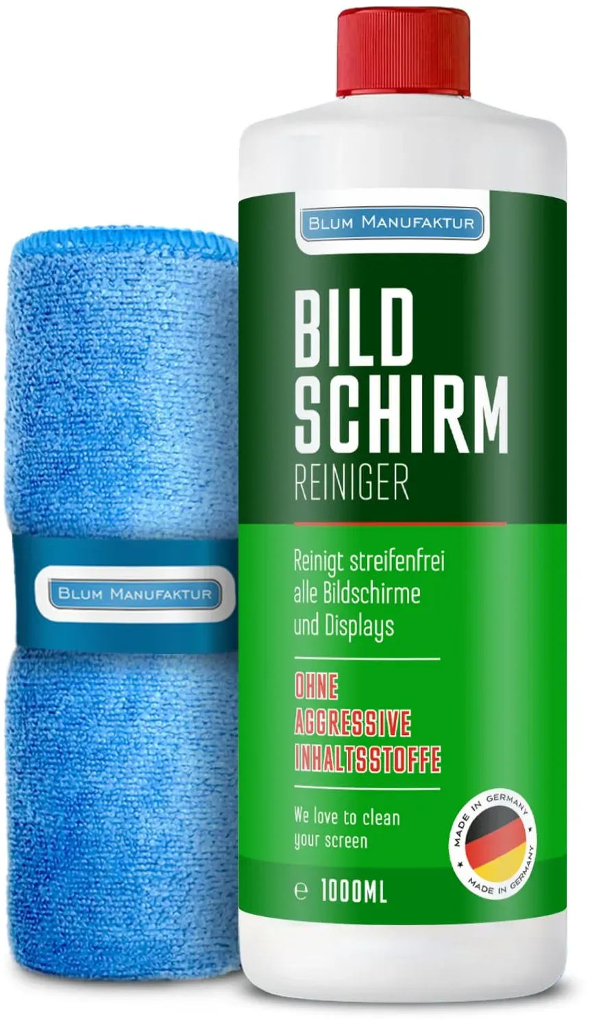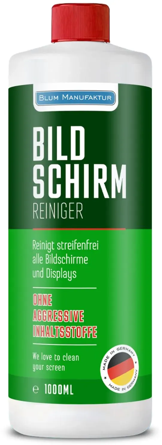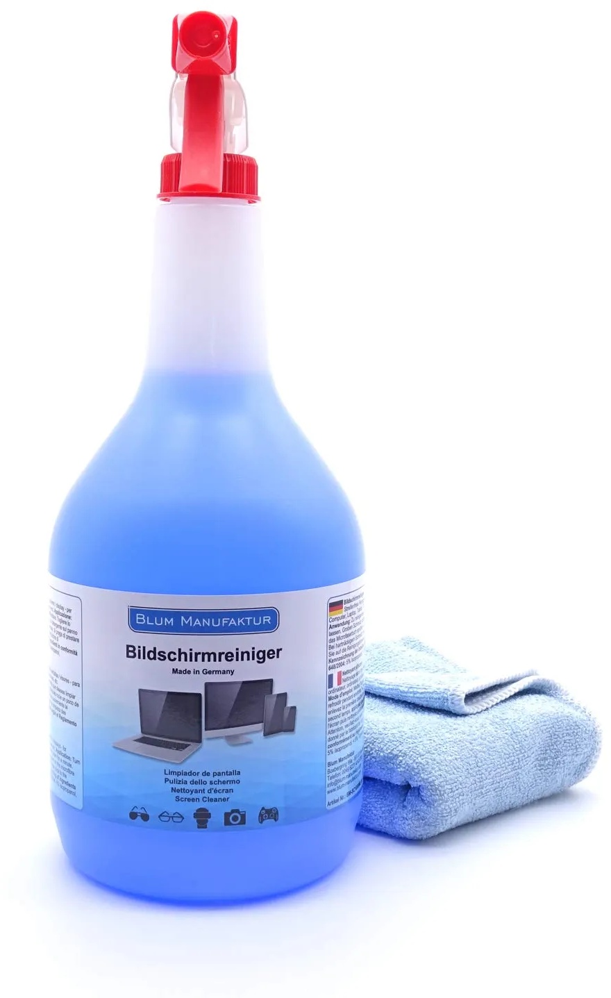 Kategorie: Reinigungsmittel - Blum Manufaktur - GTIN:0731683738330 - Blum Manufaktur 1 Liter Bildschirmreiniger Nachfüllflasche - Perfekte Reinigung Aller Bildschirme und Displays. Streifenfrei ohne Schlieren. - 20,95 Euro bei Amazon Marketplace CE - gefunden von billiger.de Dieses Angebot bietet ebenfalls 1000ml Reiniger und ein Supersoft Mikrofasertuch, was eine hervorragende Langzeitlösung darstellt. ![]() ![]() BLUM MANUFAKTUR Bildschirmreiniger 1x 1000 ml + 30x30 cm Mikrofasertuch supersoft 365GSM - Screen Cleaner - Display Reiniger