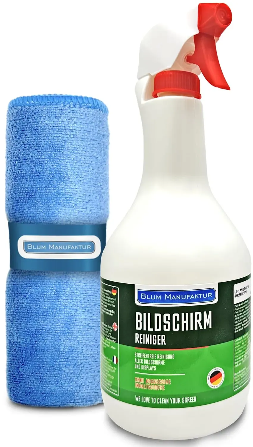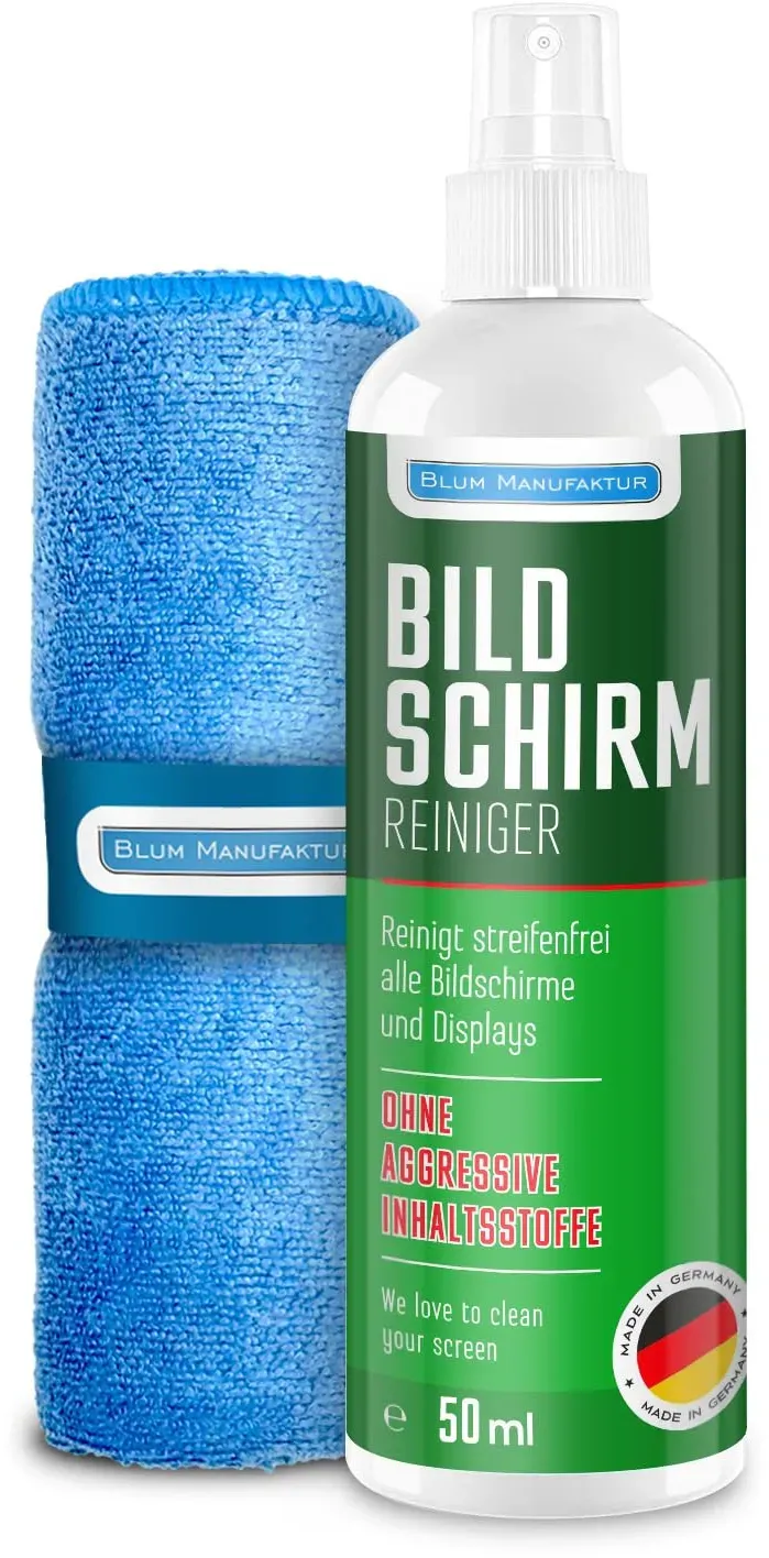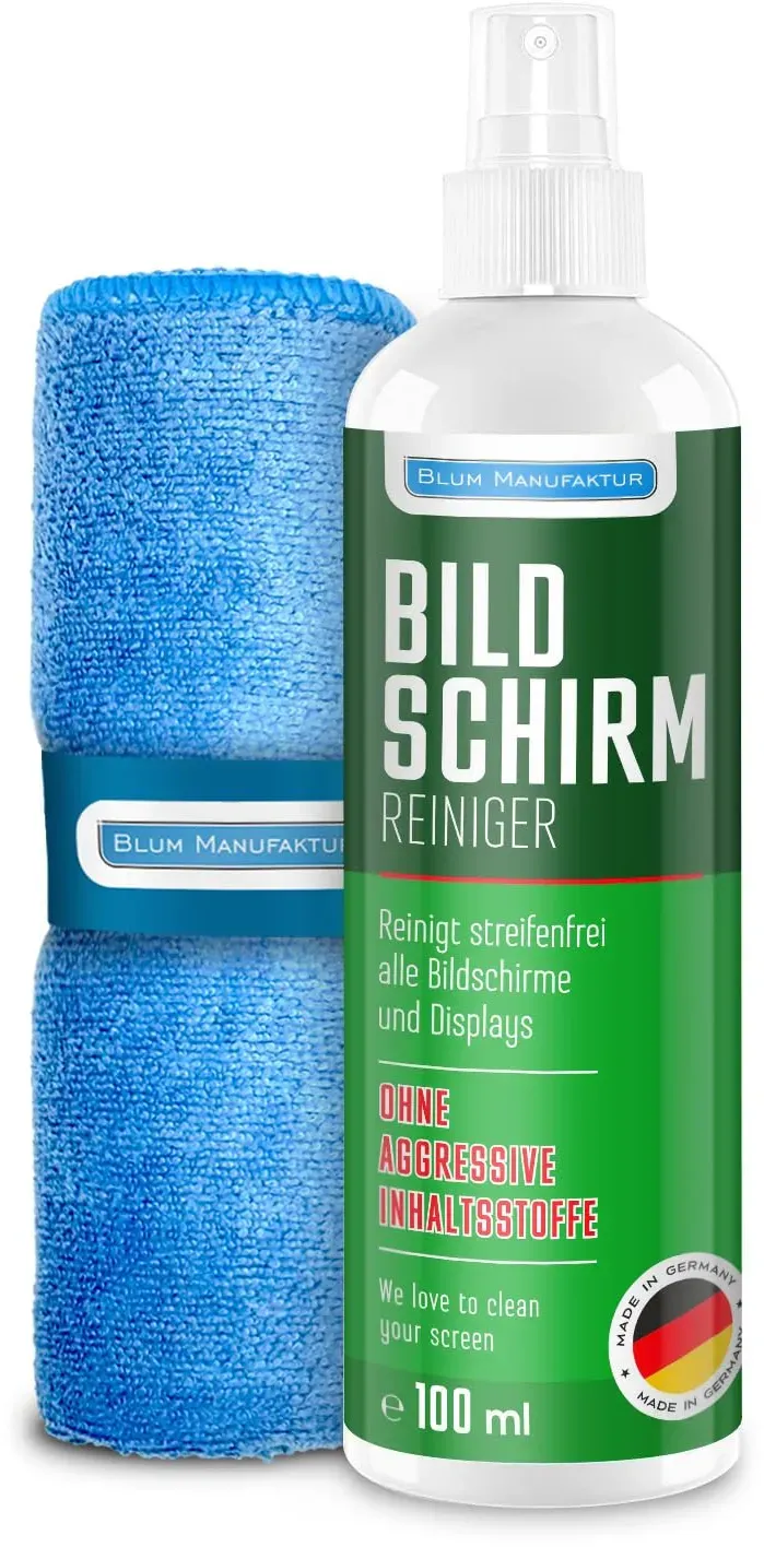 Kategorie: Reinigungsmittel - Blum Manufaktur - GTIN:0731683738330 - Blum Manufaktur 1 Liter Bildschirmreiniger Nachfüllflasche - Perfekte Reinigung Aller Bildschirme und Displays. Streifenfrei ohne Schlieren. - 20,95 Euro bei Amazon Marketplace CE - gefunden von billiger.de Dieses Angebot bietet ebenfalls 1000ml Reiniger und ein Supersoft Mikrofasertuch, was eine hervorragende Langzeitlösung darstellt. ![]() ![]() BLUM MANUFAKTUR Bildschirmreiniger 1x 1000 ml + 30x30 cm Mikrofasertuch supersoft 365GSM - Screen Cleaner - Display Reiniger
