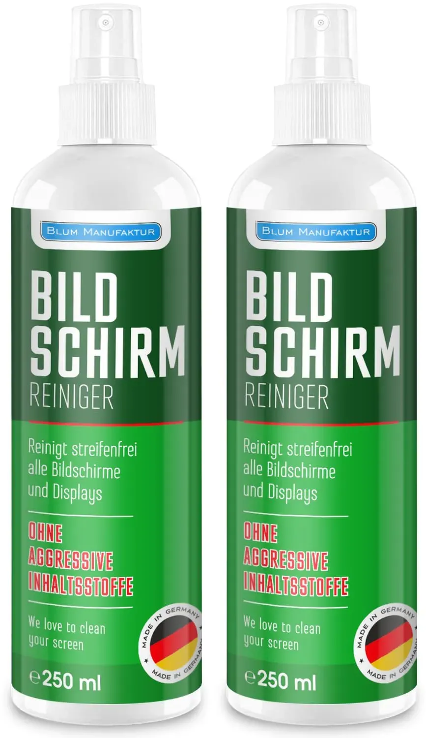 Kategorie: Reinigungsmittel - Blum Manufaktur - GTIN:4260709310046 - * HOHE REINIGUNGSKRAFT: Unser Displayreiniger entfernt mühelos hartnäckigen Schmutz, Fettflecken, Fingerabdrücke, Cremes, ohne den Bildschirm anzugreifen. Perfektes Reinigungsspray für TV LCD, LED, OLED, QLED, Touchscreen & TFT Monitor. * REINIGT ALLE DISPLAYS: Unser Screen Cleaner / Fernseherreiniger reinigt mühelos jedes Display! Egal ob Smart TV Fernseher, Laptop (auch kompatibel mit Macbook Displays), PC, Handy, Auto Displays, Tablet oder TFT Bildschirme. Der Monitorreiniger hat eine hohe Reinigungskraft dank spezieller Formel. * SCHONEND ZUR UMWELT: Unser Displayreinigungsspray reinigt, ohne den Bildschirm anzugreifen. Dieser enthält keine aggressiven oder chlorhaltige Inhaltsstoffe. Der Inhalt des Handyreinigers ist biologisch abbaubar. * + MIKROFASERTUCH: Extrem dickes & weiches Reinigungstuch mit anständigen 365GSM ! Waschbar bis 60 C und Trockner geeignet. Perfekte Reinigung von sehr empfindlichen Displays. * MADE IN GERMANY: Profi Produkt aus deutscher Herstellung. Wir sind ein Familienunternehmen aus Heidelberg. Entwicklung, Herstellung und Abfüllung in unserem Werk. - 18,95 Euro bei Amazon Marketplace CE - gefunden von billiger.de Ein praktisches Doppelpack mit 2x 250ml Reiniger für alle, die einen größeren Vorrat wünschen. ![]() ![]() Blum Manufaktur Blum - 2X 250ml Bildschirmreiniger. Perfekte Reinigung Aller Bildschirme und Displays. Streifenfrei ohne Schlieren.