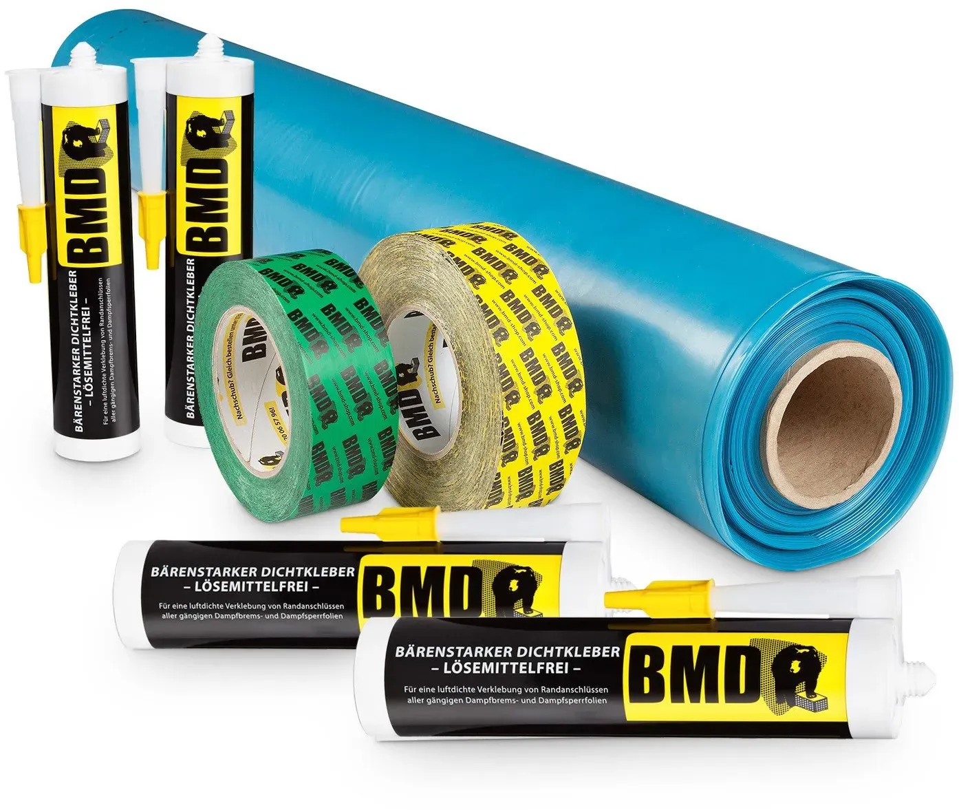 Kategorie: Sonstige Elektroinstallationsartikel - BMD - GTIN:4260209016059 - Dach-Paket (hergestellt in Deutschland) 1x Dampfbremsfolie 2mx25m (50m2) sd-wert größer 100m / Brandstoffklassse: E) 1x BMD-San Hochleistungsklebeband 50mm x 25lfm für Stöße, Durchdringungen 1x BMD-Cral Hochleistungsklebeband 50mm x 40lfm für überlappungen 2x BMD-mur bauelastischer Anschlusskleber 310ml für Folienanschluss am Mauerwerk bzw. feste Bauteile - 69,50 Euro bei Amazon Marketplace CE - gefunden von billiger.de Für größere Dämmprojekte bietet dieses Paket eine komplette Lösung für 100m² inklusive Klebeband. ![]() ![]() BMD 100m2 Dampfbremssystempaket nach DIN 4108 Teil 11 & ENEV Dampfsperrfolie Dampfbremsfolie Dampfbremse Dampfsperre Klebeband Folienkleber CE Siegel