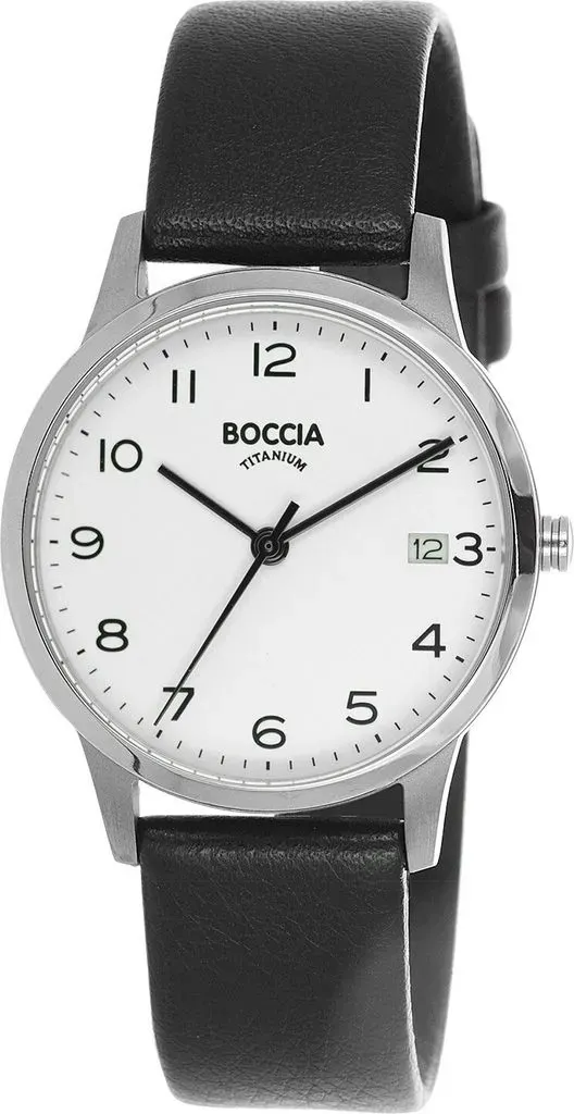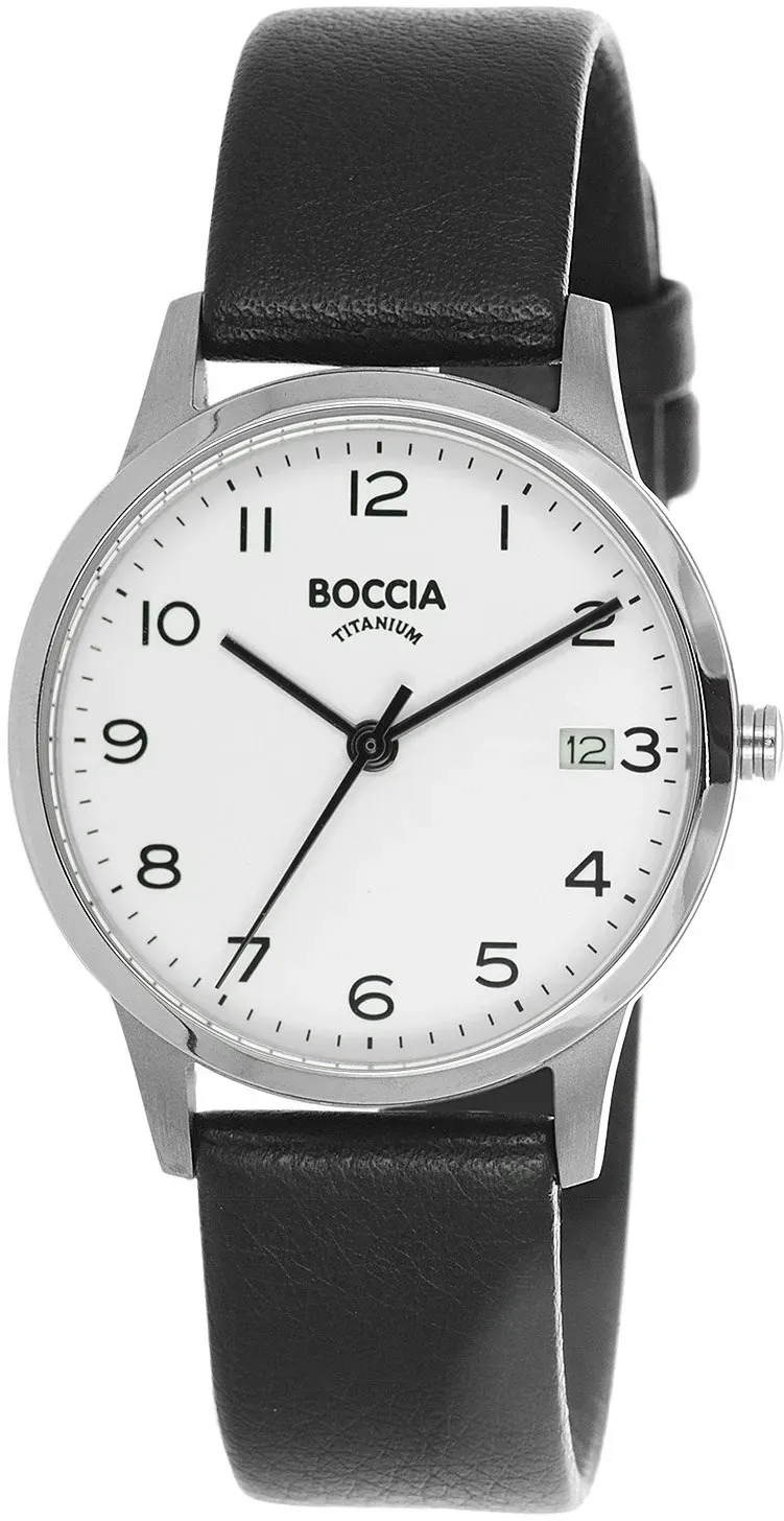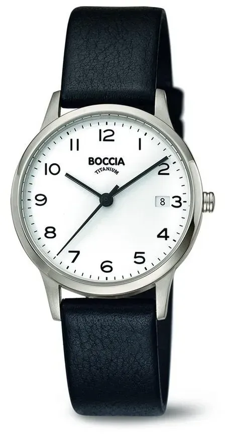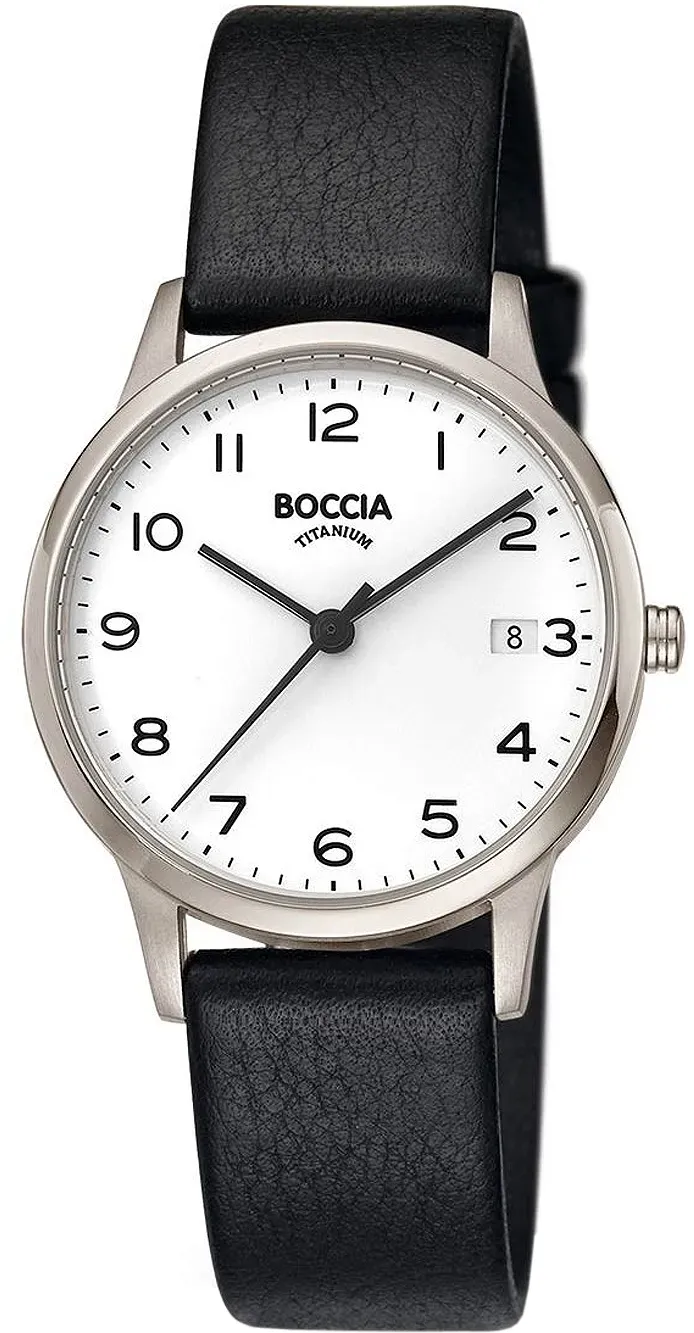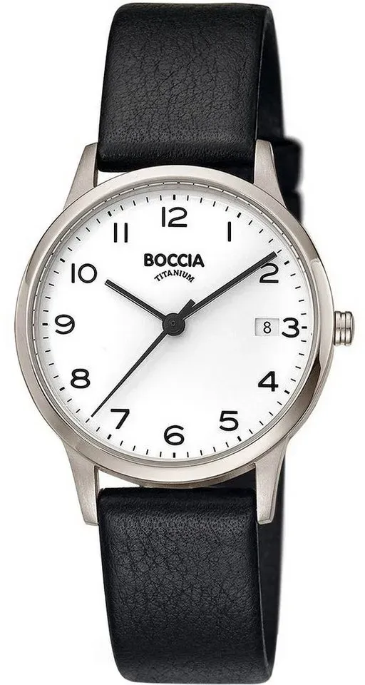 10 Händlerangebote bei billiger.de - Kategorie: Damenuhren - Boccia Titanium - Damenuhr aus Reintitan, hautfreundlich und antiallergisch, satiniertes Titangehäuse, polierte Lünette, unempfindliches Mineralglas, Armband aus schwarzem Leder mit 2 Schlaufen, polierte Dornschließe, 3-Zeiger-Quarzwerk, Datumsanzeige, silberfarbenes Zifferblatt, schwarze Zeiger und Zahlen, zentraler Sekundenzeiger, wasserdicht bis 5 bar, Durchmesser 32 mm, Höhe 7,5 mm - GTIN:4040066256221 ![]() ![]() Boccia Titanium Boccia Quarzuhr Boccia Damen Uhr 3310-01 Titan Leder schwarz, (1-tlg)