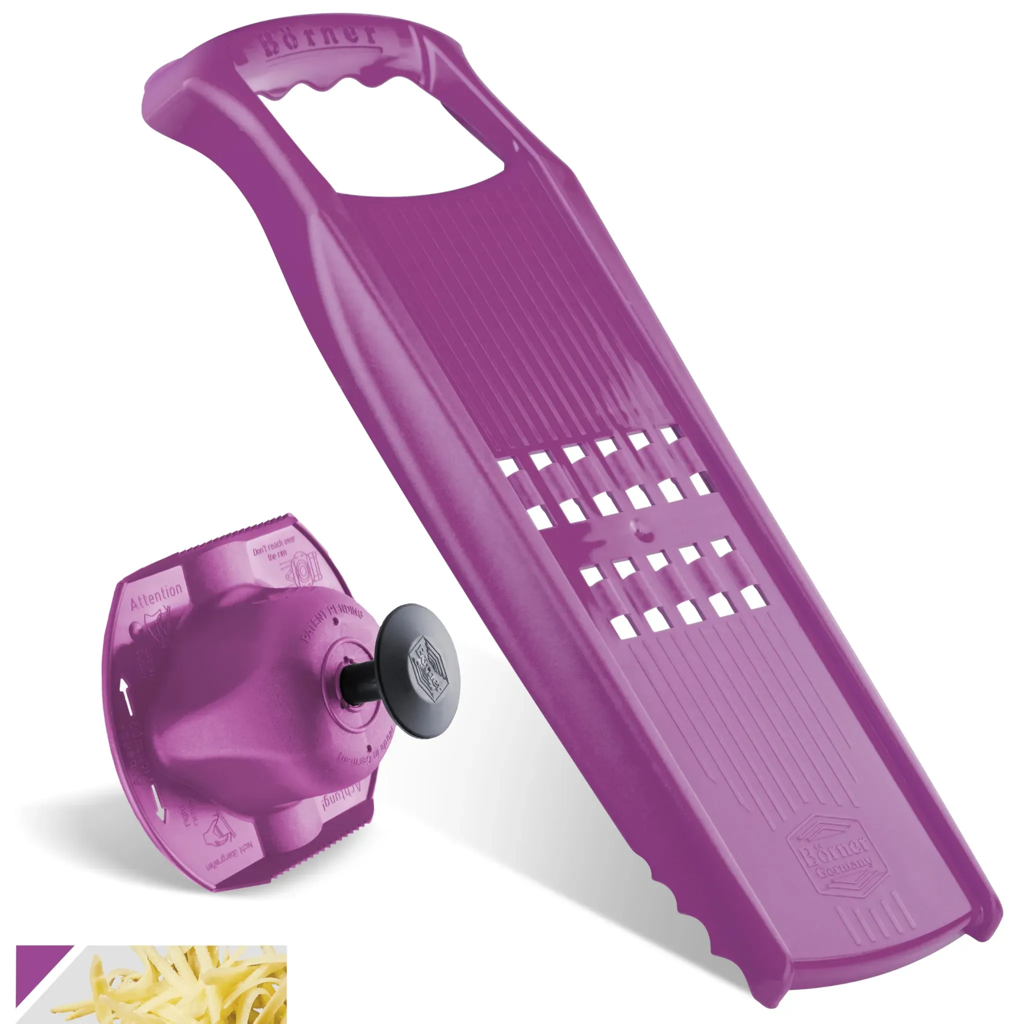 Kategorie: Reiben & Küchenreiben - Boerner Pharma - GTIN:4018093510869 - Qualitaet made in Germany: Das Unternehmen in der Eifel hat sich seit Jahren auf die Produktion von Kuechenhelfern spezialisiert. V-Hobel aber auch Julienne- oder Wellenschneider werden hier seit ueber 6 n in bester deutscher Qualitaet hergestellt. Leicht zu reinigen: Durch die Verwendung von lebensmittelechtem Kunststoff, laesst sich die Roesti Reibe besonders schnell reinigen. Zudem ist sie leicht bedienbar, weswegen Sie innerhalb kuerzester Zeit leckere und bunte Rohkost Teller anrichten koennen. 100% BPA freie Materialien fuer Ihre Gesundheit: Alle Boerner Kuechenhelfer sind aus lebensmittelechtem Kunststoff, TueV geprueft und von hoechster Guete. Gerade bei der Zubereitung von Speisen fuer Ihre Kinder sollten Sie auf hervorragende Qualitaet achten. Zum Schneiden von Obst, Gemuese und Kaese in feine Streifen! Perfekt geeignet fuer Gratinkaese und besonders fuer die Herstellung von Schweizer Roestis. Egal ob aus Kartoffeln oder anderem Gemuese. Mit der Roestireibe gelingt ihr Roesti perfekt. Einfach in der Handhabung! Durch die super Einfache Handhabung ist die Reibe fuer Jeden die perfekte Kuechenhilfe. Egal ob Gemuese und auch Obst und Kaese. Die Reibe eignet sich perfekt zum schnellen Verarbeiten der Zutaten! Schon lange keine Kartoffelpuffer oder Roesti gemacht? Mit dem original Boerner Roesti PowerLine und dem Fruchthalter wird das Schnibbeln fuer Roesti und Puffer ein Erlebnis. Egal ob ... ![]() ![]() Boerner Pharma Börner Gemüsehobel Reibe PowerLine mit Fruchthalter in violett | Gr.: onesize