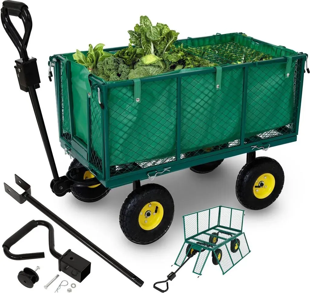 Zustand: Neu - Rasenmäherersatzteile Rasenmäherersatzteile & Rasenmäherzubehör - Wiltec - 62416 - EAN: 4251548119914 - [Einfacher Transport] - Dank des Transportwagens können Sie Gartenutensilien, Erde oder Werkzeug mühelos von A nach B transportieren. [Kompakte Abmessungen] - Trotz seiner robusten Bauweise bietet der Transportwagen eine 102 x 50 x 38 cm große Ladefläche, sodass er genügend Platz für zu transportierende Güter bietet. [Gute Stoßdämpfung] - Die dicken Reifen gewährleisten eine reibungslose Fahrt auf verschiedenen Oberflächen. Die Kombination aus dicker Bereifung und langer Handdeichsel sorgen für Komfort beim Ziehen. [Hohe Tragkraft] - Mit einer beeindruckenden Tragkraft von bis zu 550 kg ist dieser Gartenwagen ideal für den mühelosen Transport auch schwererer Lasten geeignet. [Robuste Konstruktion] - Die Handkarre verfügt über ein Gittergestell, Seitenwände aus Gitter, eine abnehmbare PVC-Plane und ein praktisches Ablagegitter, das in den Rahmen des Wagens eingespannt wird. - Verkäufer: Wiltec Wildanger Technik GmbH im amazon.de Marketplace Dieser Fangqi Bollerwagen für 139 Euro bietet Luftreifen, einen gummibeschichteten Metallgriff und abnehmbare Seitenwände für maximale Flexibilität. ![]() ![]() Fangqi Bollerwagen Metall Gartenwagen 550kg belastbar, Grün (Luftreifen,Gummibeschichteter Metallgriff,Abnehmbare Seitenwände), Luftreifen & Herausnehmbare Plane grün