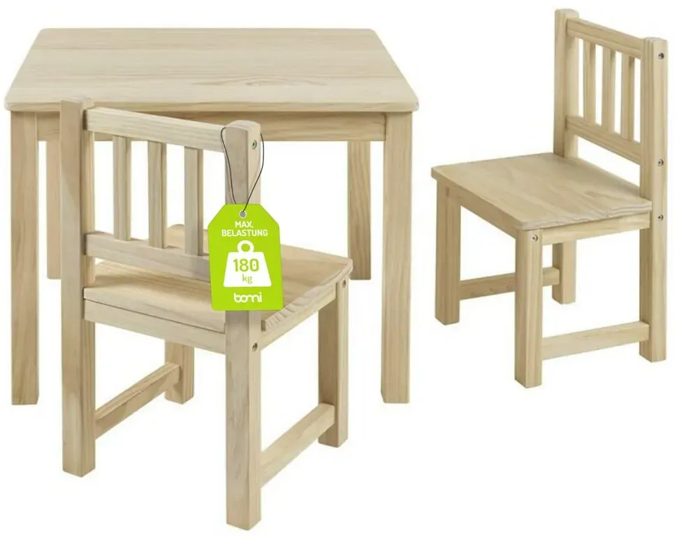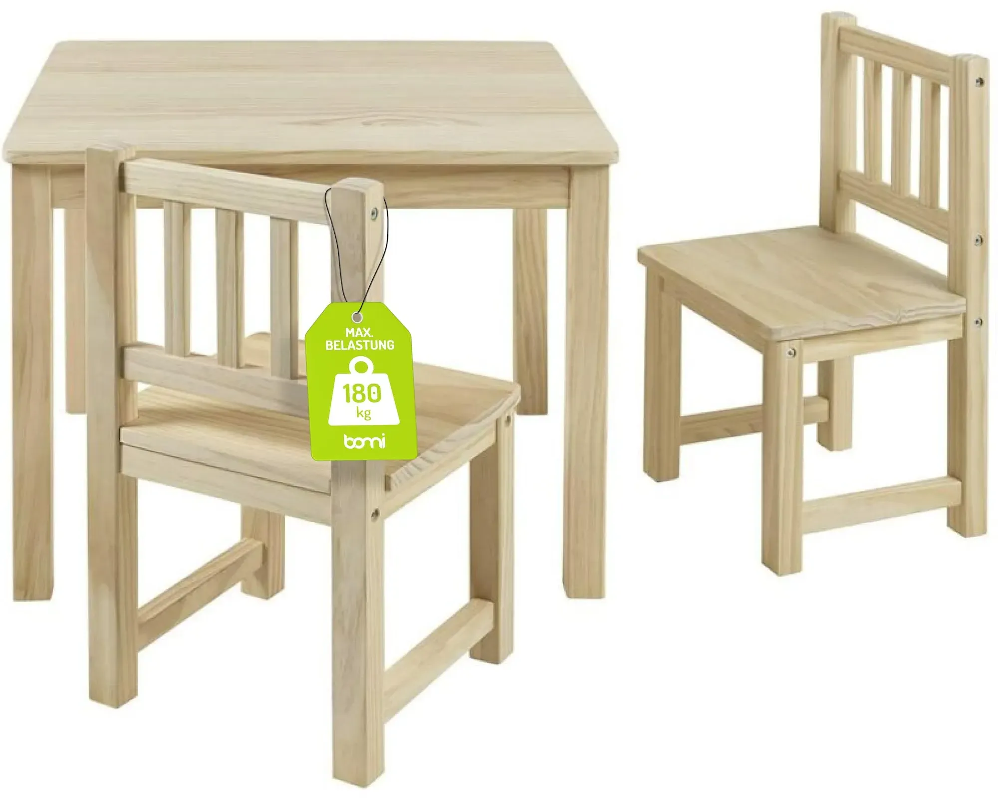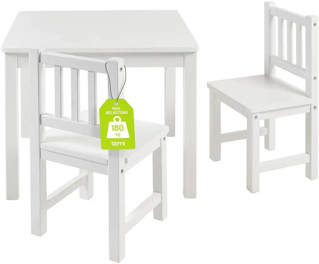 Kategorie: Kinderzimmermöbel - Bomi - GTIN:4260525189277 - Für Kinder zwischen 36 Monaten und n ist die BOMI Sitzgruppe Amy nicht nur ein bequemes Sitzmöbel, welches bis zu 180KG belastbar ist, sondern bietet gleichzeitig ein Platz zum Malen und Essen. Diese Sitzgruppe bringt also Bequemlichkeit, Ordnung und wohnliches Ambiente in das Kinderzimmer der Jüngsten.Unsere hochwertigen Holz-Produkte der Marke BOMI werden sorgfältig aus nachhaltigem Kiefernholzgefertigt, das nicht nur für seine natürliche Schönheit steht, sondern auch unser festes Engagement für umweltfreundliche Praktiken und verantwortungsbewusste Waldwirtschaft unterstreicht.Maße und Lieferumfang der Kindersitzgruppe im überblick:Lieferumfang: 1 x Tisch, 2 x StühlchenTisch: Oberfläche: 56 x 52 cm - Höhe: 48 cmStühle: Sitzfläche: 24 x 27 cm, Sitzhöhe: 27 cm, Gesamthöhe: 53,5 cmDie Beschichtung unserer Kindermöbel sind lebensmittelecht, speichelfest und nach DIN EN 71-3 zugelassen. Die Ecken und Kanten der Stühle und des Tischchens sind abgerundet.Mit Sicherheit zu einem jahrelangen SitzvergnügenDie Ecken und Kanten der Stühle und des Tischchens sind abgerundet. Die Stühlchen sind für Kinder bis zu n ausgelegt und können mit bis zu 180 kg belastet werden. Da können sich auch die Eltern, Großeltern oder andere Erwachsene Besucher einmal auf einen Kindertee einladen lassen, ohne beim Hinsetzen mit dem Zusammenbruch des Sitzmöbels rechnen zu müssen. Ein Tisch, an dem die Erwachsenen mit den Kindern basteln, malen ... ![]() ![]() BOMI Kindermöbel BOMI Kindersitzgruppe Amy aus Kiefer Massiv Holz für Kleinkinder, Mädchen und Jungen Natur Weiß - Naturbelassen/Weiß