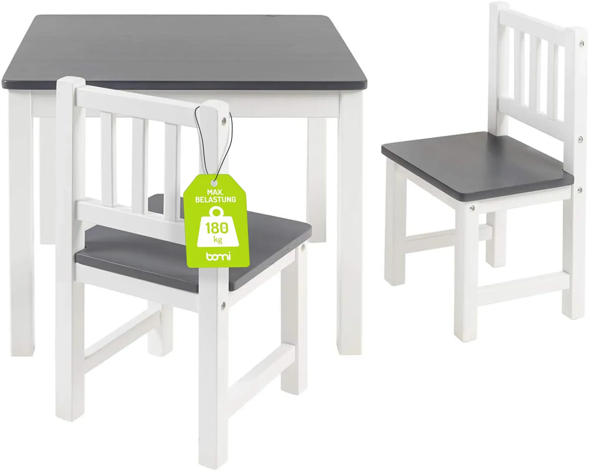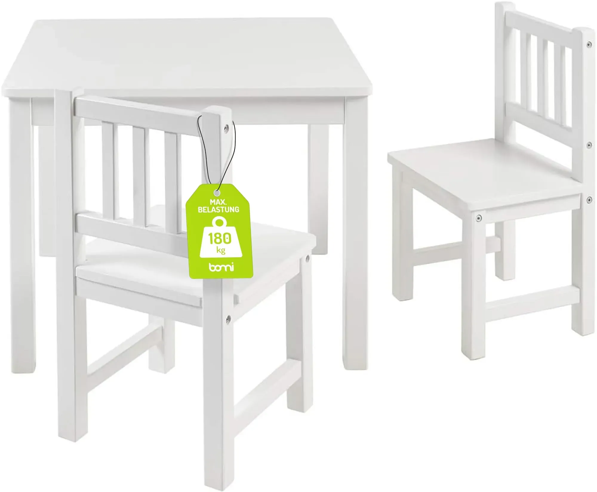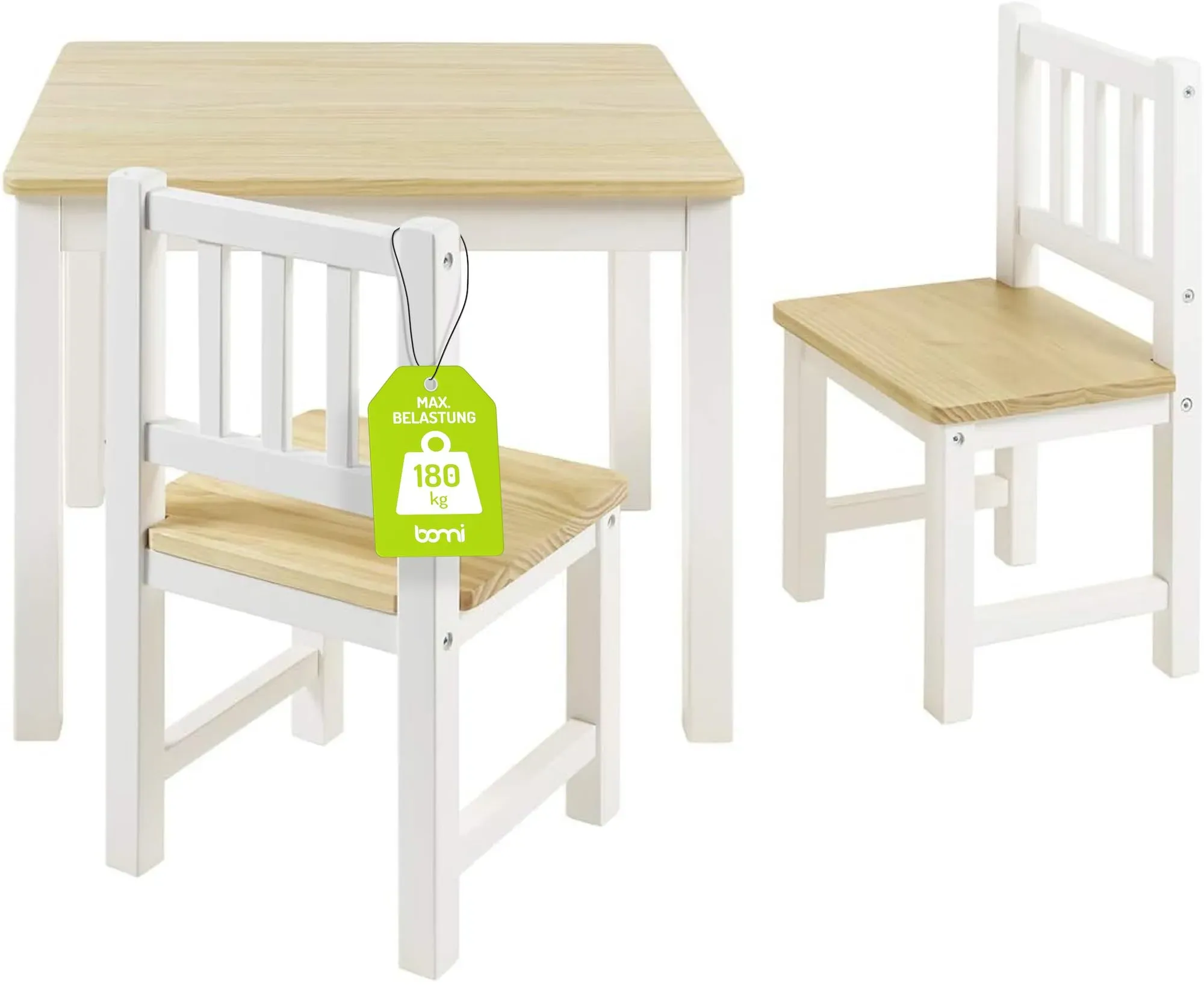 Kategorie: Kinderzimmermöbel - Bomi - GTIN:4260525189277 - Für Kinder zwischen 36 Monaten und n ist die BOMI Sitzgruppe Amy nicht nur ein bequemes Sitzmöbel, welches bis zu 180KG belastbar ist, sondern bietet gleichzeitig ein Platz zum Malen und Essen. Diese Sitzgruppe bringt also Bequemlichkeit, Ordnung und wohnliches Ambiente in das Kinderzimmer der Jüngsten.Unsere hochwertigen Holz-Produkte der Marke BOMI werden sorgfältig aus nachhaltigem Kiefernholzgefertigt, das nicht nur für seine natürliche Schönheit steht, sondern auch unser festes Engagement für umweltfreundliche Praktiken und verantwortungsbewusste Waldwirtschaft unterstreicht.Maße und Lieferumfang der Kindersitzgruppe im überblick:Lieferumfang: 1 x Tisch, 2 x StühlchenTisch: Oberfläche: 56 x 52 cm - Höhe: 48 cmStühle: Sitzfläche: 24 x 27 cm, Sitzhöhe: 27 cm, Gesamthöhe: 53,5 cmDie Beschichtung unserer Kindermöbel sind lebensmittelecht, speichelfest und nach DIN EN 71-3 zugelassen. Die Ecken und Kanten der Stühle und des Tischchens sind abgerundet.Mit Sicherheit zu einem jahrelangen SitzvergnügenDie Ecken und Kanten der Stühle und des Tischchens sind abgerundet. Die Stühlchen sind für Kinder bis zu n ausgelegt und können mit bis zu 180 kg belastet werden. Da können sich auch die Eltern, Großeltern oder andere Erwachsene Besucher einmal auf einen Kindertee einladen lassen, ohne beim Hinsetzen mit dem Zusammenbruch des Sitzmöbels rechnen zu müssen. Ein Tisch, an dem die Erwachsenen mit den Kindern basteln, malen ... ![]() ![]() BOMI Kindermöbel BOMI Kindersitzgruppe Amy aus Kiefer Massiv Holz für Kleinkinder, Mädchen und Jungen Natur Weiß - Naturbelassen/Weiß