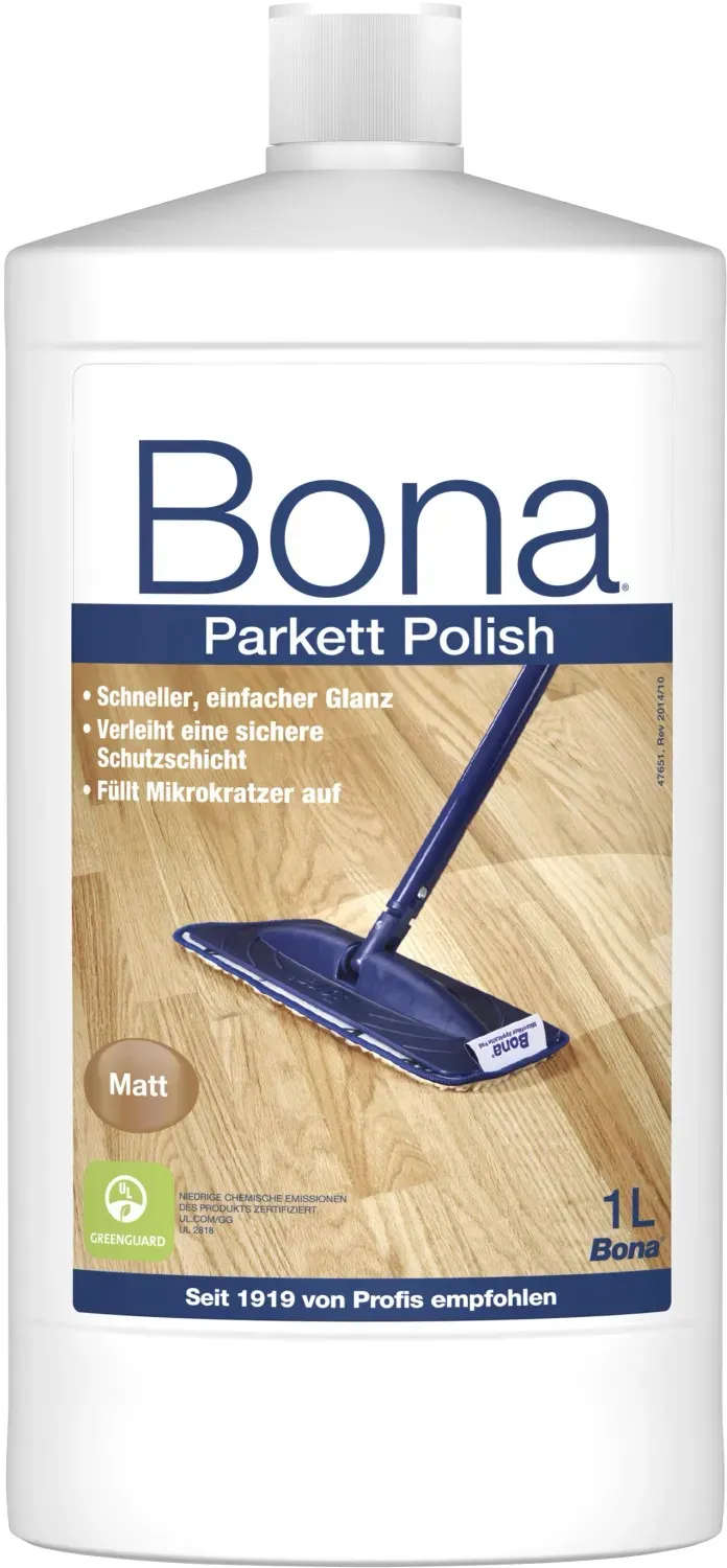 Zustand: Gebraucht - 18,09 € / l - Bodenreinigung Bodenreiniger - Bona - WP511013015 - EAN: 7312799651565 - PARKETTREINIGER: Erwecke stumpfe Böden mit einem herrlichen Glanz wieder zum Leben PARKETT PFLEGEÖL: Eine Schicht Polish füllt Mikrokratzer im Belag des Bodens auf und sorgt für ein gleichmäßiges Erscheinungsbild EINFACH AUFTRAGEN: Unsere Reinigungsmittel sind gebrauchsfertig; Kein mischen, kein messen, kein spülen; Einfach auftragen, wischen und fertig QUALITÄT: Die GREENGUARD-GOLD-Zertifizierung gewährleisten ein sicheres Produkt für Familie, Haustiere und Umwelt VARIANTEN: Der Parkett Polish ist in matt und glänzend erhältlich VERBRAUCH: Eine 1-Liter-Flasche reicht für ca. 50 m² Boden Bona - Seit 1919 von Profis empfohlen - 1 Händler im amazon.de Marketplace Für einen matten Look auf lackierten Holzböden ist dieses Polish von Amazon eine empfehlenswerte Option. ![]() ![]() Bona Parkettpflege Polish Matt, Parkettreiniger und Parkettpflege matt, für lackierte Holzböden 1 L, Parkettpflege versiegeltes Parkett, Parkett Politur, Parkett Pflegemittel