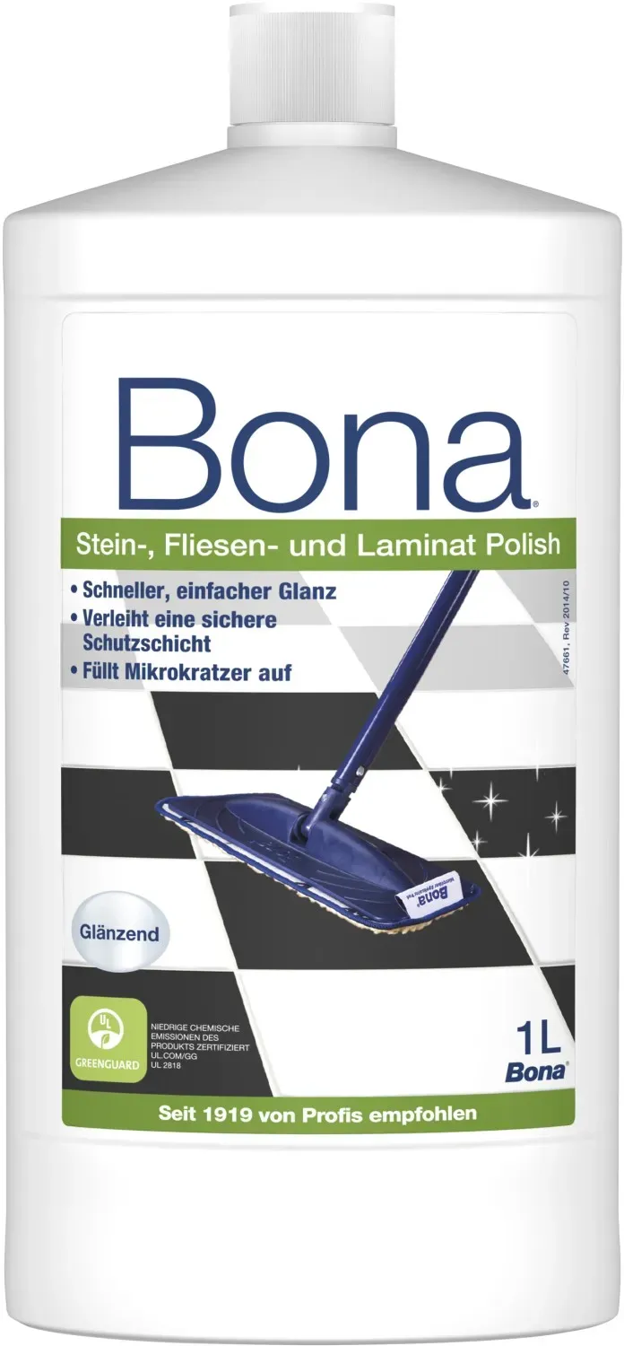 Kategorie: Reinigungsmittel - Bona - GTIN:7312799652562 - Bona Stein-, Fliesen- und Laminat Polish ist ein gebrauchsfertiges Glanzpflegemittel für die meisten Hartböden, wie Laminat, PVC, Linoleum, unglasierte Fliesen (Keramik, Bruchstein), Stein und versiegelter Marmor. Es verleiht neuen Glanz und schützt lang anhaltend vor Verschleiß. Eine Schicht Polish schützt vor Verschleiß und Abnutzung und verlängert die Lebensdauer des Bodenbelags. Eine 1-Liter-Flasche reicht für ca. 50 m2 Boden. Die Greenguard-Gold-Zertifizierung gewährleisten ein sicheres Produkt für Familie, Haustiere und Umwelt. Bona - seit 1919 von Profis empfohlen. - 17,99 Euro bei OBI - gefunden von billiger.de Dieses glänzende Parkett Polish von Amazon ist eine beliebte Wahl für lackierte Holzböden und bietet eine gute Versiegelung. ![]() ![]() Bona Parkett Öl Polish Glänzend, Parkettreiniger und Parkettpflege für lackierte Holzböden 1 L, Parkett Politur, Parkett Pflegemittel, Parkett Versiegelung