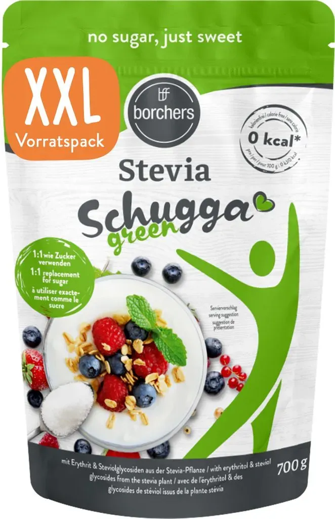 Zustand: Neu - 18,56 € / kg - NYR2023 - borchers borchers fine food GmbH & Co. KG - 04507-01 - EAN: 4260175671429 - 🥄STEVIA SCHUGGA GREEN: Fein abgestimmte Mischung aus Erythrit und Steviolglycosiden aus der Stevia-Pflanze. Dank der Basis auf Erythrit kann die Streusüße 1 : 1 wie Haushaltszucker verwendet werden ˜•VIELSEITIG EINSETZBAR: Einfach perfekt zum Süßen von Speisen & Getränken oder zum Kochen & Backen. Gleiche Süßkraft wie Zucker und das bei 0 Kalorien! ðŸ‘KALORIENBEWUSSTE ERNÄHRUNG: Schugga green bietet eine natürliche Süße ohne Kalorien und dank des niedrigen glykämischen Indexwertes hat der Verzehr einen geringen Einfluss auf den Blutzuckerspiegel* 🦷ZAHNFREUNDLICH: Im Gegensatz zu Zucker trägt Erythrit nicht zur Bildung von Karies bei und unterstützt außerdem den Erhalt der Zahnmineralisierung* 🌱VEGAN: Gewonnen aus den Blättern der Stevia-Pflanze sind die verwendeten Steviolglycoside von Natur aus vegan. Genau wie das eingesetzte Erythrit, das aus Mais gewonnen wird œ GEPRÜFT & ABGEFÜLLT IN DEUTSCHLAND: Unsere borchers Produkte werden in Deutschland geprüft und nach höchsten Qualitätsstandards für Sie abgefüllt 🩶ERFAHRUNG SEIT 2005: Die Marke borchers steht für fast 2 Erfahrung und Leidenschaft in der Entwicklung von Zuckeralternativen und weiteren Produkten - Für alle, die bewusst genießen wollen 🗒ï¸DETAILS: Weitere Produktdetails und Anwendungstipps finden Sie unten in der Produktbeschreibung - Verkäufer: foodsetter im amazon.de Marketplace ![]() ![]() borchers Schugga - - no eBay sugar, just sweet 700g (18,56 EUR/kg)