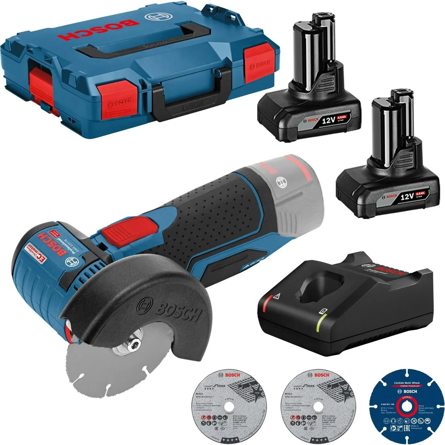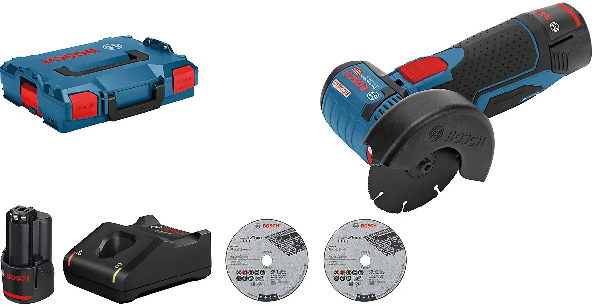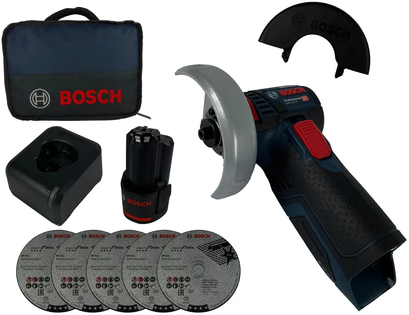 lieferbar-in 2-3 Werktagen bei dirBosch Professional Akku-Winkelschleifer GWS 12V-76, mit Akku 2 Ah und Ladegerät in Tasche inkl. 5tlg. Trennscheiben-Set blau