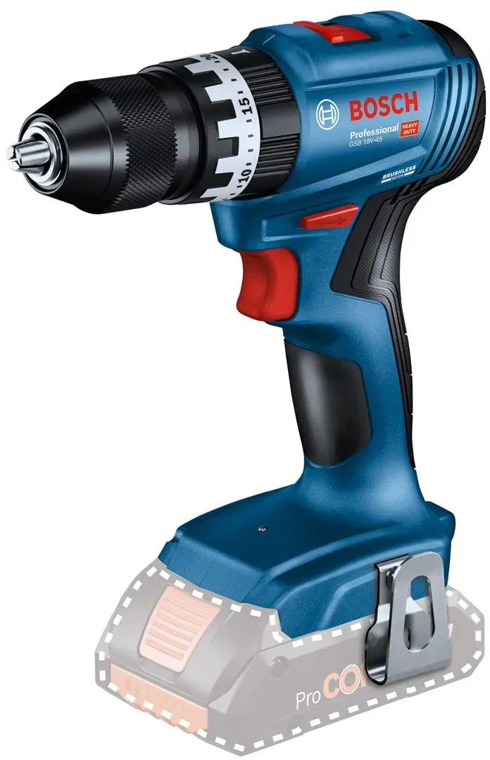 Verfügbarkeit: 1-5 Werktage - 122,39 €/Stück - Kategorie: Akkuschrauber - Bosch - GTIN:4059952605616 - # Zuverlässige Power im kompaktesten Bosch Professional 18V-Schrauber Der Bosch Professional Akku-Bohrschrauber GSR 18V-45 mit seinem bürstenlosen Motor für eine längere Lebensdauer und Laufzeit pro Ladung liefert mit einem maximalen Drehmoment von 45 Nm hervorragende Leistung und sorgt mit einer Drehzahl von 1.900 minˆ’1 für schnellen Arbeitsfortschritt. Der Bohrschrauber hat ein robustes 13-mm-Metallfutter und eine ausgezeichnete Drehmomentübertragung für alle gängigen Anwendungen. Er bietet eine exzellente Handhabung dank seiner kurzen Kopflänge von 159 mm und eines Gürtelclips für bequemes Tragen. Der GSR 18V-45 Professional ist ideal für kleine bis mittelgroße Schrauben mit einem maximalen Bohrdurchmesser von 8 mm, einen maximalen Bohrdurchmesser in Holz bis 35 mm und einen maximalen Bohrdurchmesser in Stahl bis 10 mm. # AMPShare 18V Akkuallianz €“ Viele Marken. Viele Maschinen. Ein Akkusystem. Dieser Artikel ist Teil der AMPShare 18V Akkuallianz. Dabei handelt es sich um den Verbund verschiedener Profi-Marken für Handwerk und Industrie, die ein gemeinsames Akku-System für 18V Maschinen nutzen. Dieses basiert auf der Akku-Technologie von Bosch Professional. AMPShare Akkus sind damit vollständig kompatibel mit allen Akku-Werkzeugen dieser stetig wachsenden Gemeinschaft führender Markenhersteller. Dazu zählen €“ neben Bosch Professional (blaue ... Ein solides Angebot für den GSB 18V-45 Schlagbohrschrauber als Solo-Gerät, gut geeignet für Anwender, die bereits über Akkus und Ladegeräte verfügen. Contorion. de