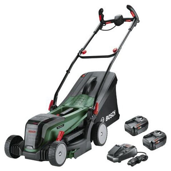Kategorie: Rasenmäher - Bosch - GTIN:4059952641867 - Kraftvoll mähenDer Akku-Rasenmäher UniversalRotak 2x18V-37-550 von Bosch überzeugt durch kraftvolles Mähen dank bürstenlosem Motor und 36V-Elektronik (2 x 18 V). Die beiden 18-Volt-Akkus liefern zusammen eine starke 36-Volt-Leistung, die für eine hervorragende Mähleistung sorgt.Sauberer RasenDer hochwertige Textil-Grasfangkorb mit Füllstandsanzeige sorgt für saubere Rasenflächen. Der Grasfangkorb fasst 40 Liter und lässt sich dank der Füllstandsanzeige einfach entleeren.Ideal für mittlere bis große RasenflächenMit einer Schnittbreite von 37 cm ist der Rasenmäher ideal für mittelgroße bis große Rasenflächen bis 550 m2. Die Schnitthöhe lässt sich zentral in 5 Stufen zwischen 25 und 70 mm einstellen.Komfortabel und effizientDer Mäher ist mit ergonomischen ErgoFlex-Griffen ausgestattet, die eine optimale Griffhaltung ermöglichen und die Belastung für Arme und Rücken reduzieren. Die Rasenkämme beschleunigen die Arbeit, indem sie die Grashalme in das Mähwerk führen und für einen sauberen Schnitt an Kanten und Wänden sorgen.Weitere Vorteile:Kompatibel mit Bosch 18V POWER FOR ALL AkkuSyneon Technologie für optimale Leistung und maximale LaufzeitBürstenloser Motor für lange Lebensdauer und hohe LeistungZusammenklappbarer Textil-Grasfangkorb für kompakte Aufbewahrung Akku-Spannung18VAkku-Kapazität4,0 Ah (2x)Akku-Empfehlung = 4,0 AhAkkuladezeit1,600 hAkkuschnellladezeit80 % geladen in 65 minAkkutypLithium-IonenEmpfohlene ... Dieses "Solo"-Angebot für 303.62 Euro ist eine weitere Option für den Rasenmäher ohne Akku und Ladegerät. ![]() ![]() Bosch Akku-Rasenmäher UniversalRotak 2x18V-37-550, Solo - 06008B9E01