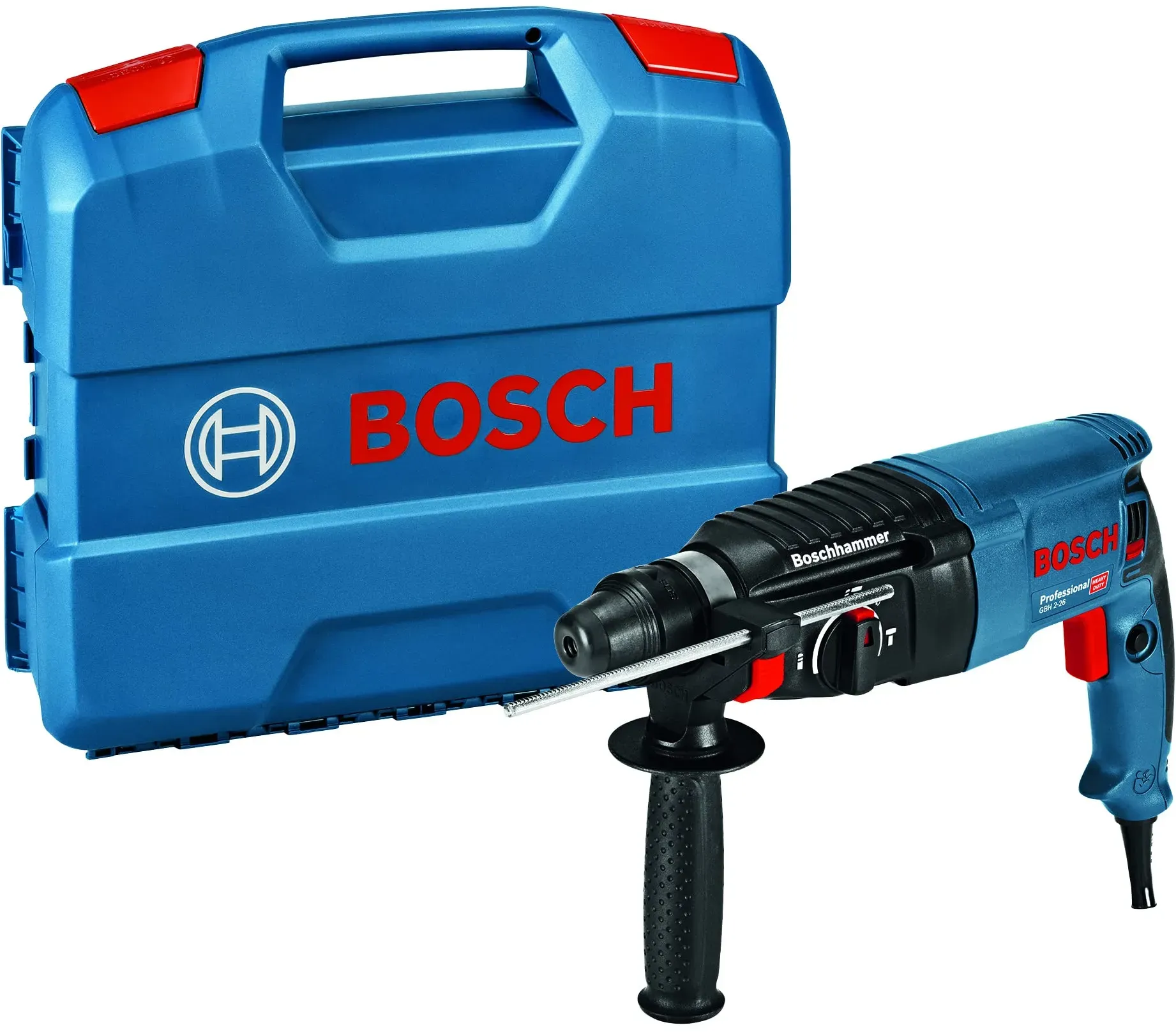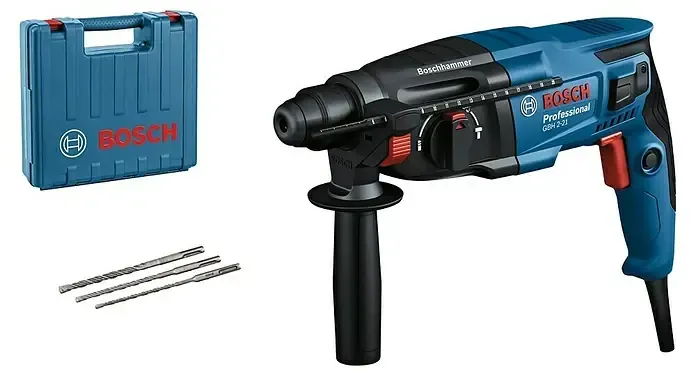 Kategorie: Bohrhämmer - Bosch - GTIN:4059952569642 - # So klein, so stark der kompakte und kraftvolle Bohrhammer der Einstiegsklasse Der Bosch Professional Kombihammer GBH 2-21 mit SDS plus-Technologie ist die ideale, kompakte Lösung der Einstiegsklasse für kraftvolles Hammerbohren. Er eignet sich: * zum Schlagbohren/Hammerbohren in Beton, Ziegel und Gestein * für leichte Meißelarbeiten * zum Bohren ohne Schlag in Holz, Metall, Keramik und Kunststoff * zum Schrauben. Sein starker 720-Watt-Motor und eine Schlagenergie von 2,0 Joule gewährleisten effektives Hammerbohren in Beton bis zu einem Durchmesser von 21 mm. Dieser kompakte Bohrhammer bietet erschwingliche Bosch Profi-Hammerbohrleistung. Vielseitigkeit und überzeugende Ergebnisse werden durch die drei Bohrhammereinstellungen zum Hammerbohren, Bohren und Meißeln sichergestellt. Mit dem Gasgebeschalter kann die Drehzahl variabel bestimmt werden, sodass die Leistung des Geräts steht auf das zu bearbeitende Material oder die gewählte Anwendung optimal abgestimmt ist. Durch die Schalterarretierung kann bequem gearbeitet werden, ohne dass der Gasgebeschalter dauerhaft gedrückt gehalten werden muss. Die SDS Plus Technologie ermöglicht eine hervorragende Kraftübertragung für kleine Hämmer. Dank Tiefenanschlag kann die Bohrtiefe optimal eingestellt werden. Der Bosch Bohrhammer verfügt über einen Link-Rechts-Lauf und ist mit mehreren Systemzubehören zur Staubabsaugung von Bosch kompatibel (z. B. GDE 16 plus, separat erhältlich). ... Dieser kabelgebundene Bohrhammer ist ein beliebter Allrounder für den professionellen Einsatz mit guter Leistung und umfassendem Zubehör. ![]() ![]() Bosch Professional Bohrhammer GBH 2-26 (Leistung 830 Watt, SDS-Plus Werkzeugaufnahme, inkl. Tiefenanschlag, Zusatzhandgriff, Maschinentuch, Handwerkoffer)