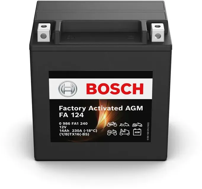 Kategorie: Motorradbatterien - Bosch Automotive - GTIN:4047026640229 - Motorradbatterie BOSCH 0 986 FA1 240 AGM 12V 14Ah 230A FA124 - 72,78 Euro bei retromotion.com - gefunden von billiger.de ![]() ![]() Bosch FA124 - AGM-Motorradbatterie - 12V 230A 14Ah - Geeignet für Motorräder, Motorräder, Enduros, Roller, Quads, Jetskis - Kompatibel M6021, M6022, BTX16-BS, BTX16