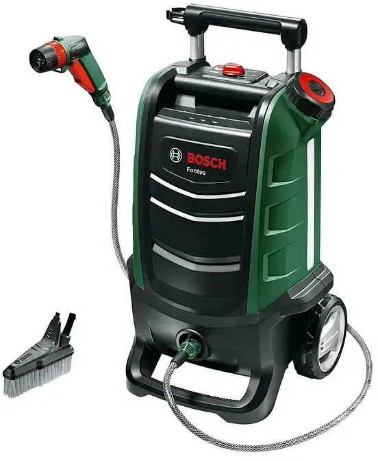 Kategorie: Hochdruckreiniger - Bosch - GTIN:4059952547930 - Der Fontus Akku-Hochdruckreiniger von Bosch ist unabhängig von Strom- und Wasseranschluss mobil einsetzbar. Die vier verschiedenen Sprühbilder und der einstellbare Wasserdruck ermöglichen eine individuelle Nutzung Punktstrahl für hartnäckigen Schmutz, 15 -Fächerstrahl für Präzision auf kleineren Oberflächen, 50 -Fächerstrahl zum Abbrausen größerer Bereiche und ein Duschstrahl zum sanften Reinigen. Mit dem 15 Liter Wasserbehälter lassen sich auch größere Objekte wie Gartenmöbel und Fahrräder schnell und mühelos reinigen. Der Fontus besitzt eine neue Leitungswassereinspeisung zur Verwendung von Leitungswasser mit integriertem Wasserfilter für unterbrechungsfreies Arbeiten. Die aufsteckbare SmartBrush ist ideal zum Putzen von Fenstern und Fahrrädern. Eine Zubehöraufbewahrung und die Lagerung der Pistole während der Verwendung machen die Reinigung sogar noch bequemer. Der ausziehbare Griff, stabile Räder und der 4 Meter lange Schlauch sorgen für höchsten Komfort. # Power for All 18V Akkuallianz Ein einziger Akku für Ihr gesamtes Zuhause Dieser Artikel ist Teil der 18V Power for All Akkuallianz. Sie besteht aus verschiedenen Marken, die Akku-Geräte speziell für Anwendungen in und ums Haus bereitstellen und als Basis ein gemeinsames Akku-System nutzen. Dieses fußt auf der Akku-Technologie von Bosch Home & Garden. Power for All 18V Akkus sind demnach mit allen 18V Akku-Maschinen aus diesem stetig wachsenden Verbund ... Ein solides Angebot für einen Akku-Hochdruckreiniger, der eine gute Balance zwischen Preis und Leistung bietet. ![]() Akku-Hochdruckreiniger BOSCH, schwarz, Hochdruckreiniger