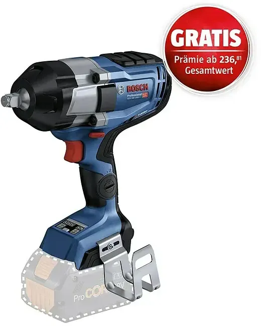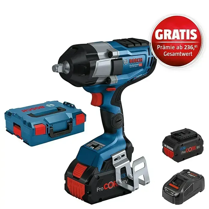 499 /Stück - Kategorie: Akkuschrauber - Bosch - GTIN:4059952548524 - # Akku-Drehschlagschrauber mit Biturbo Brushless-Technologie Der Bosch Professional 1/2'-Akku-Drehschlagschrauber GDS 18V-1000 C mit Biturbo Brushless-Technologie und einstellbaren Betriebsarten bietet volle Leistung bei anspruchsvollen Arbeiten. Seine Biturbo Brushless-Technologie kombiniert ein starkes Anziehmoment von 1.000 Nm und ein Losbrechmoment von 1.600 Nm, und ist voll optimiert für ProCore18V-Akkus. Zwei Standardbetriebsarten am User Interface, Metallmodus (A) und Holzmodus (B), sind auswählbar, um gebrochene Schraubenköpfe und den Verlust von Metallschrauben oder -muttern zu vermeiden, indem der Drehschlagschrauber verlangsamt oder ausgeschaltet wird. Jede Betriebsart kann über die Bosch Toolbox App individuell eingestellt werden. Für zusätzliche Flexibilität und Kontrolle ist dieser Akku-Drehschlagschrauber mit drei verschiedenen Geschwindigkeits-/Drehmomentstufen ausgestattet. Der Drehschlagschrauber eignet sich für anspruchsvolle Arbeiten und ist die richtige Wahl zum Anziehen und Lösen von Metallschrauben und -muttern bis M 24 in unterschiedlichen Arbeitsbereichen von Stahlbaukonstruktionen bis zur Rohrmontage und Fahrzeuginstandhaltung oder bei Verwendung von Schrauben/Ankerbolzen in Holzkonstruktionen. Er ist kompatibel mit allen Bosch Professional 18V-Akkus und -Ladegeräten (Professional 18V System); für maximale Leistung ProCORE18V 5,5 Ah verwenden. Der GDS 18V-1000 C Professional ... Dieses Set bietet eine gute Ausstattung mit 2x ProCORE 18V 5.5Ah Akkus, Schnellladegerät und L-BOXX, was es zu einem Rundum-Sorglos-Paket macht. ![]() ![]() Bosch GDS 18V-1000 C Professional inkl. 2x ProCORE 18V 5.5Ah, Schnellladegerät GAL 1880 CV, L-BOXX-Einlage, L-BOXX