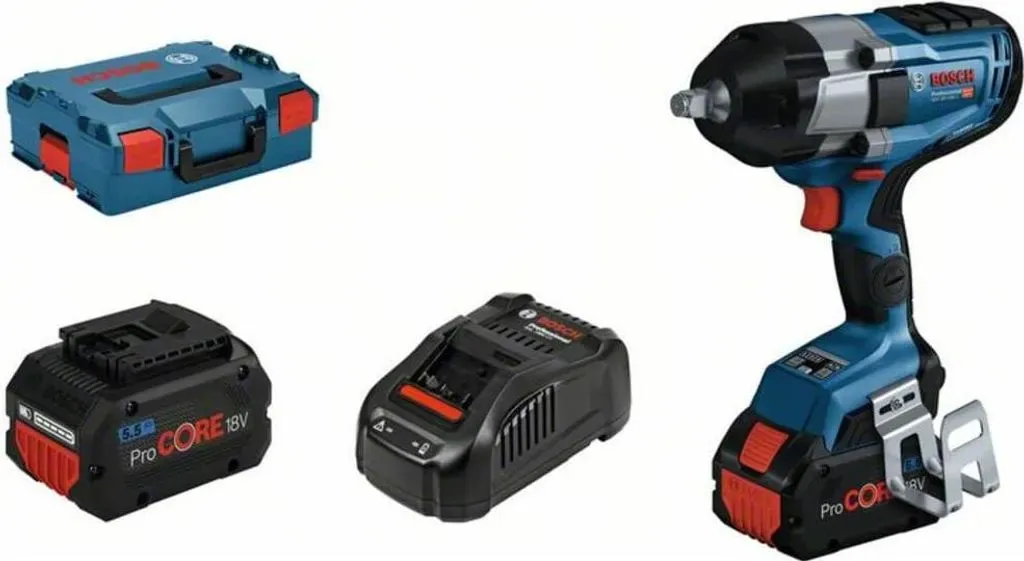 Elektrowerkzeug Elektrowerkzeuge - EAN:4059952548524 - Eigenschaften: Akku-Drehschlagschrauber GDS 18V-1000 C, Leistungsstarker 1/2'-Akku-Drehschlagschrauber mit einstellbaren Betriebsarten und BITURBO Brushless-Technologie, BITURBO Brushless-Technologie liefert ein Anziehmoment von 1.000 Nm und Losbrechmoment von 1.600 Nm, User Interface mit zwei Betriebsarten: Metall (A) und Holz (B) Weitere Betriebsarten können über die Toolbox App individuell eingestellt werden, Mehr Flexibilität und Kontrolle durch drei Geschwindigkeits-/Drehmomentstufen, 2 x Akku ProCORE18V 5.5Ah (1 600 A02 149), Schnellladegerät GAL 1880 CV (1 600 A00 B8G), 1/1 L-BOXX-Einlage für Gerät und Ladegerät (1 600 A02 58), L-BOXX 136 (1 600 A01 2G0) (06019J8003) - gefunden von Kelkoo Ein Premium-Set mit zwei 8.0Ah ProCORE18V Akkus in L-BOXX, ideal für professionelle Anwender mit hohem Leistungsbedarf. Contorion. de