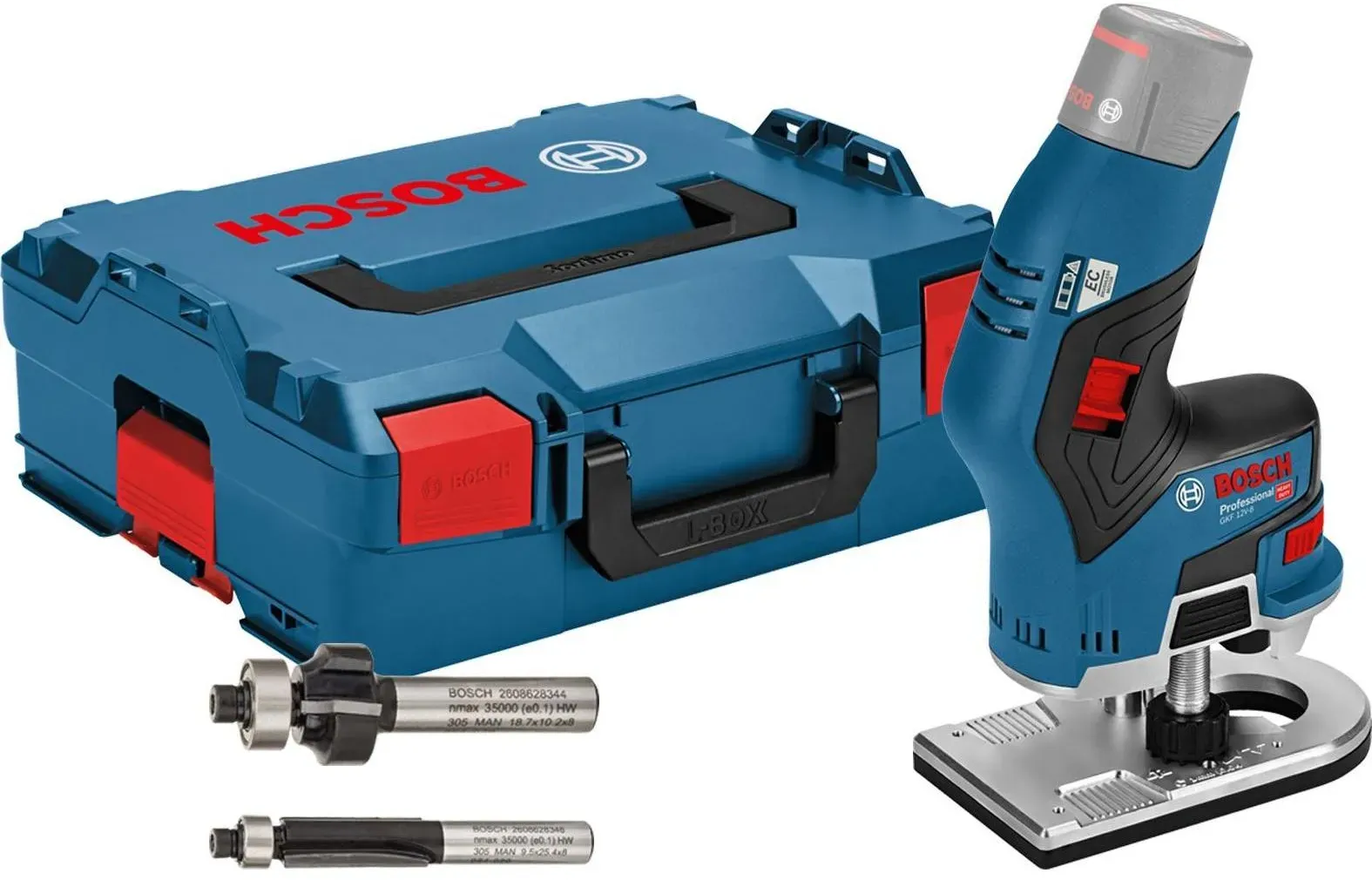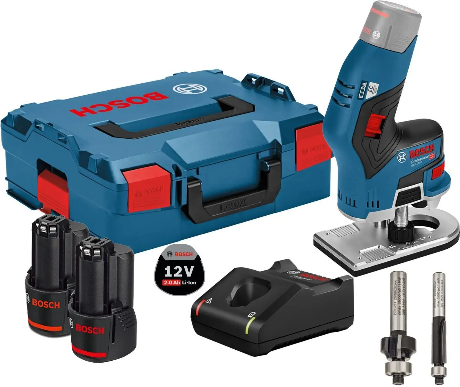 lieferbar-in 1-2 Werktagen bei dirBosch Professional Akku-Fräse GKF 12V-8 , Inkl. 2x Akku 3,0Ah und Schnellladegerät GAL 12V-40, in L-BOXX