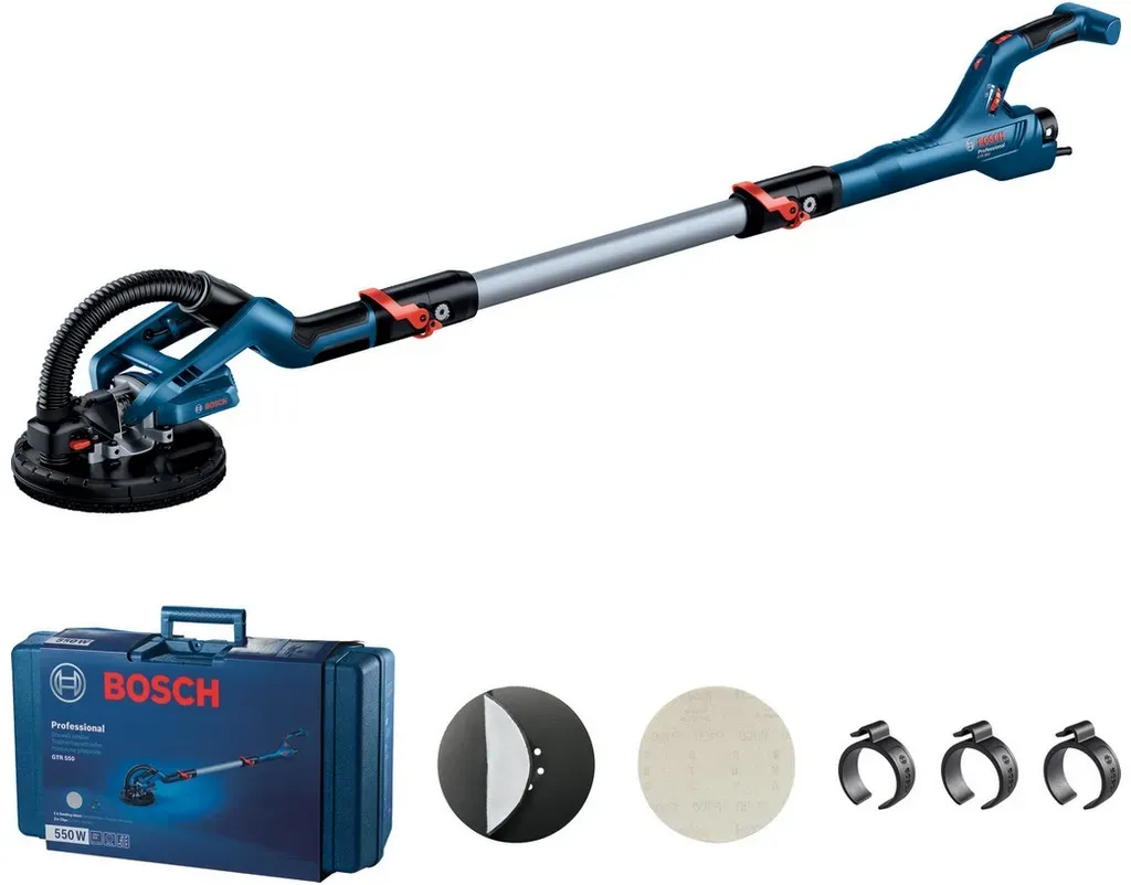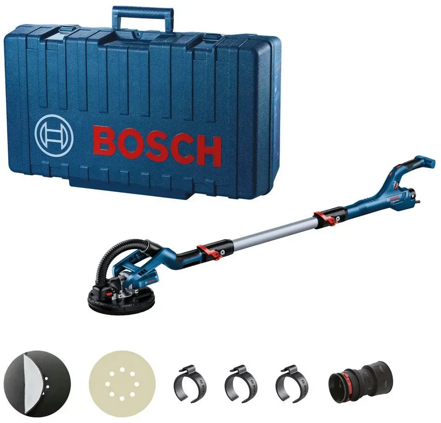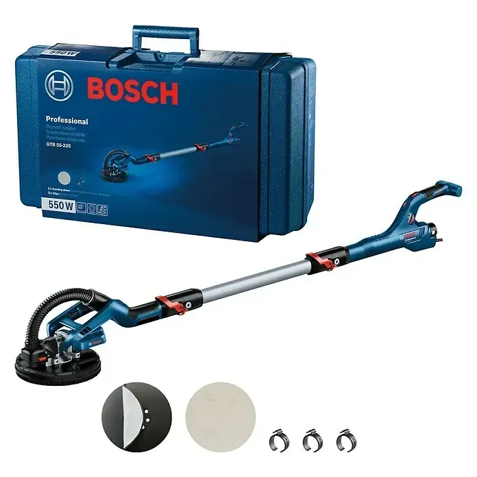 Winkelschleifer, Vibrationsschleifer Elektrowerkzeuge - EAN:4059952616605 - Effizientes Schleifen mit dem Langhalsschleifer GTR 55-225 von BOSCH ProfessionalMit dem Langhalsschleifer GTR 55-225 von BOSCH Professional wird das Schleifen von Trockenwänden zum Kinderspiel. Hier sind die herausragenden Merkmale im Detail:Müheloses SchleifenDer GTR 55-225 ermöglicht ein müheloses Schleifen von Trockenwänden, was die Arbeitszeit deutlich verkürzt und die Effizienz steigert. So ist er ein zuverlässiger Partner für Arbeiten im Innenausbau.Patentierter, ultraflexibler SchleifkopfDank des patentierten, ultraflexiblen Schleifkopfs gleitet das Gerät mühelos über Decken und Wände. Das Risiko von Oberflächenschäden wird so deutlich reduziert.DeckenansaugfunktionDie integrierte Deckenansaugfunktion reduziert das gefühlte Werkzeuggewicht erheblich und ermöglicht ermüdungsärmeres Arbeiten, besonders bei längeren Anwendungen. Zusätzlich sorgt der ergonomische Zusatzhandgriff in L-Form erhöht den Komfort und verringert die Muskelbelastung, insbesondere beim Schleifen in unbequemen Positionen.Leistungsstark und zuverlässigMit einer Leistung von 240 W und einem Schleifteller-Durchmesser von 215 mm ist der GTR 55-225 der ideale Partner für größere Arbeiten im Trockenbau.Für Profis im InnenausbauDer Langhalsschleifer GTR 55-225 eignet sich perfekt für Trockenbauer, Gipser, Maler und Handwerker, die umfangreiche Schleifarbeiten an Wänden und Decken oder Oberflächenvorbereitungen durchführen.Mit ... Dieses Angebot von Werkzeugstore24 beinhaltet den Bosch Trockenbauschleifer GTR 55-225 inklusive Zubehör-Set, was ein gutes Gesamtpaket darstellt. ![]() ![]() Bosch Trockenbauschleifer GTR 55-225 inkl. Zubehör-Set - 06017D4000