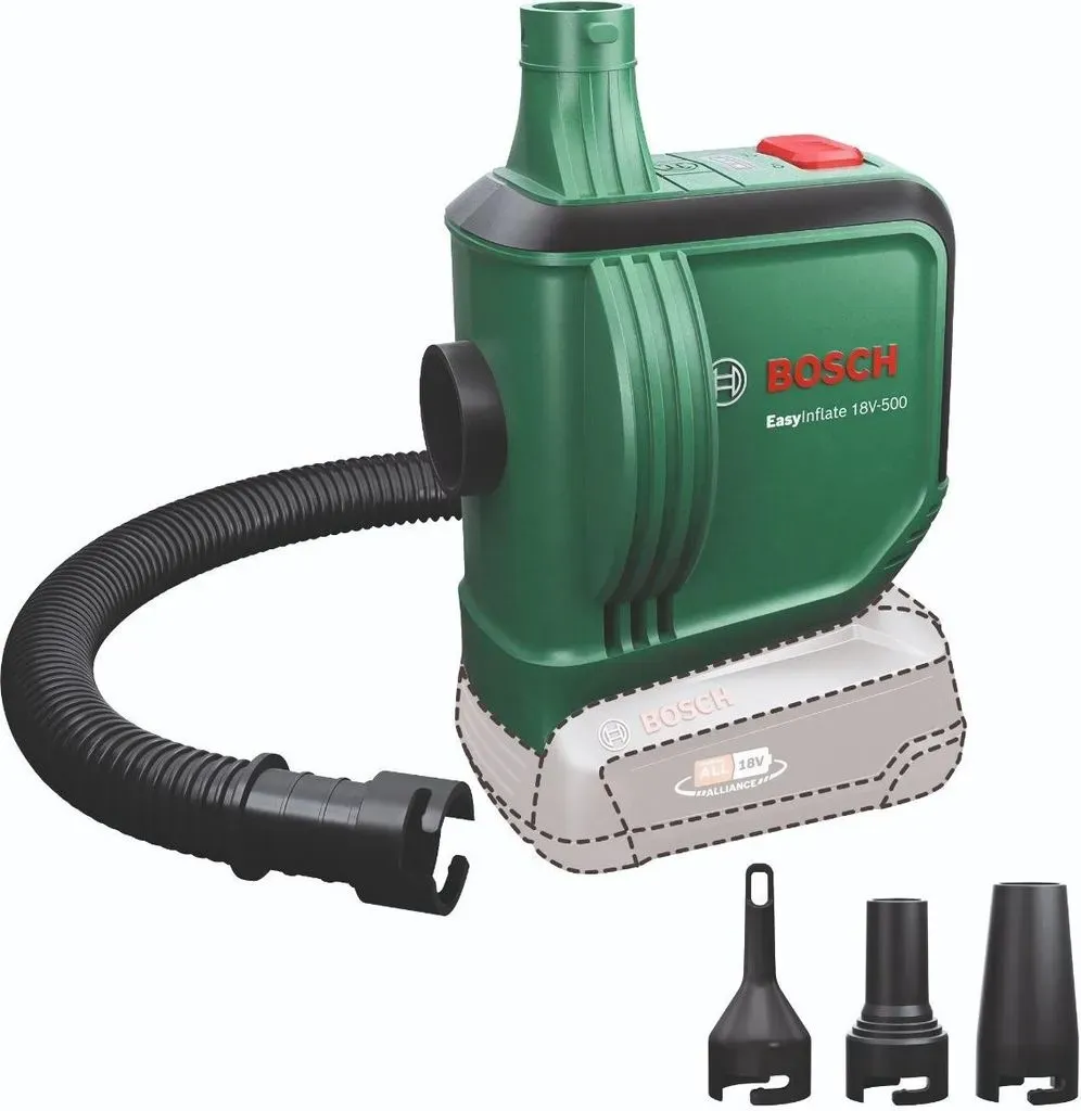 Kategorie: Luftpumpen - Bosch - GTIN:4053423240115 - Die EasyInflate 18V-500 eignet sich ideal für Innen- und Außenanwendungen. Flexibilität wird durch 3 verschiedne Düsen und zusätzlichem Schlauch gewährt. Eine Leistungsstarke Befüllung und Entleerung wird durch den 18V-Bosch Akku ermöglicht, welcher eine überaschende Laufzeit von größer 40 min (2,0 Ah) mit sich bringt. Des Weiteren ist die EasyInflate 18V-500 Teil der 18V POWER FOR ALL ALLIANCE, bestehend aus Geräten führender Marken. Der nicht im Lieferumfang enthaltene Akku ist kompatibel mit allen Produkten der 18V POWER FOR ALL ALLIANCE und kann damit von Gartenarbeiten bis zur Reinigung und anspruchsvollen Heimwerkeraufgaben genutzt werden. - 39,75 Euro bei voelkner - gefunden von billiger.de Die EasyInflate 18V-500 ist hier als Solo-Gerät ohne Akku erhältlich, ideal für Nutzer, die bereits Bosch 18V Akkus besitzen und eine kostengünstige Lösung suchen. ![]() Manomano.d e