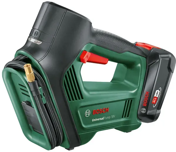sonstige Accessoires (Freizeit) Elektrowerkzeuge - EAN:6949509233936 - Leistungsstark und handlich: die BOSCH Home & Garden Akku-Luftpumpe UniversalPump 18VEntdecken Sie die BOSCH Home & Garden Akku-Luftpumpe UniversalPump 18V - mit einem maximalen Druck von 10.3 bar ist sie die perfekte Lösung für alle Aufpumpaufgaben! Dank des beleuchteten Manometers sehen Sie immer, wie viel Druck bereits in den Gegenstand gepumpt wurde. Selbst bei schwierigen Lichtverhältnissen ist das Manometer leicht abzulesen. Zusätzlich ist die Pumpe mit einer hellen LED-Lampe ausgestattet, sodass sie auch bei Nacht ohne Probleme eingesetzt werden kann. Trotz ihrer hervorragenden Leistung bleibt die Pumpe kompakt und handlich, was sie vielseitig einsetzbar und besonders benutzerfreundlich macht.Bosch Power for All: Home & Garden GerätesystemDie Luftpumpe wird mit einem 18V Lithium-Ionen-Akku (separat erhältlich) der Power for All Serie betrieben. Dieser Akku kann flexibel für alle Bosch Home & Garden Geräte benutzt werden und Sie sparen sich dadurch den Kauf mehrerer Akkus. Die Akkuspannung von 18 V und die Akkukapazität von 1,5 Ah bieten ausreichend Energie für verschiedene Anwendungen, ohne dass Sie sich in der Nähe einer Steckdose befinden müssen.Die ideale Pumpe für Auto, Fahrrad und Co.Dank der mitgelieferten Zubehörteile - darunter ein französisches Ventil, eine Ballnadel und ein Volumenadapter für das Aufpumpen größerer Objekte wie Luftmatratzen - ist die UniversalPump für verschiedene ... Dieses Angebot der EasyInflate 18V-500 inklusive Akku ist ein gutes Komplettpaket für den sofortigen Start. ![]() ![]()