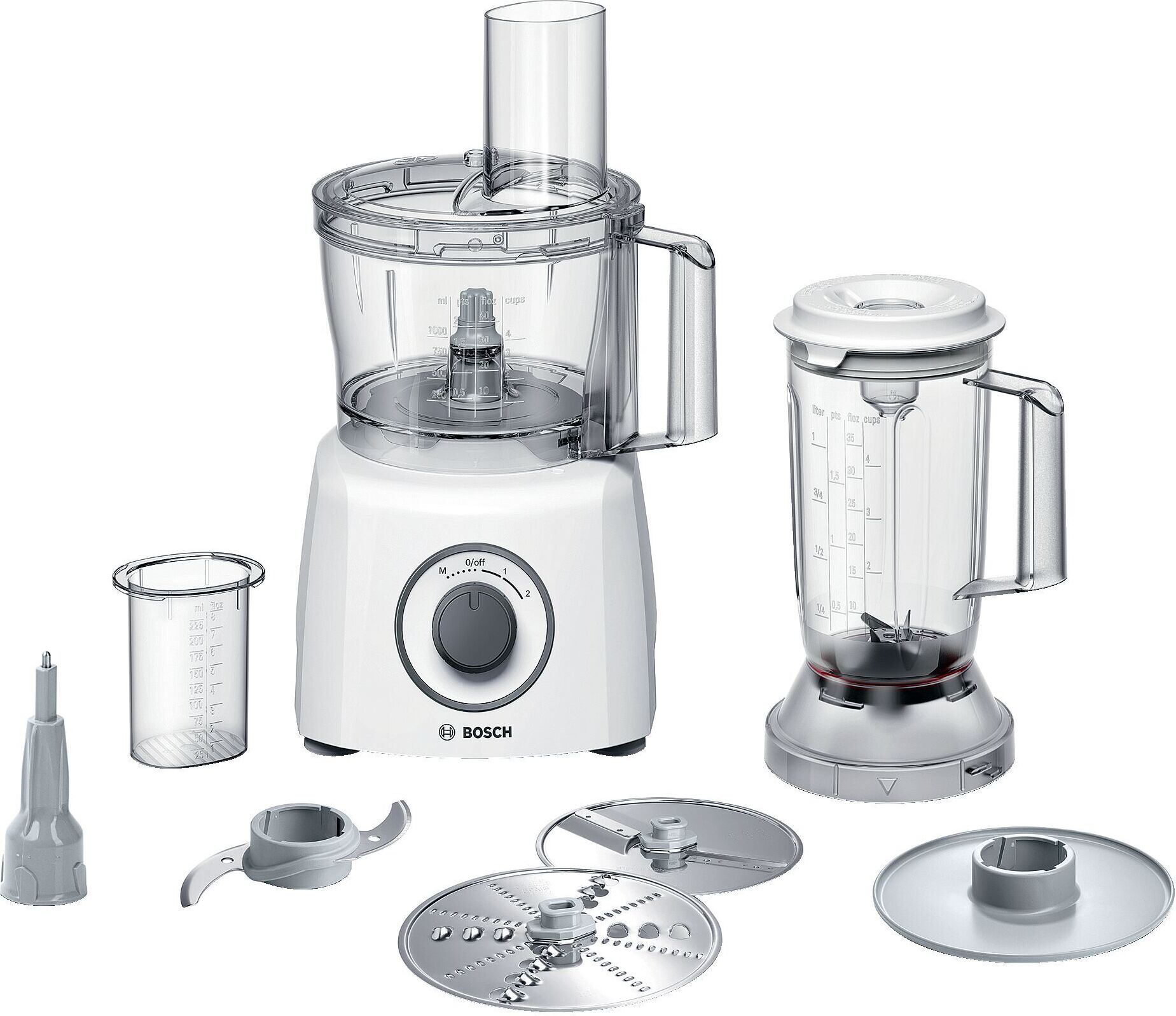 Auf Lager Versand durch AmazonBosch Kompakt-Küchenmaschine Multi Talent 3, 30 Funktionen, Universalmesser, Schneide/ Raspeln, Schlagscheibe, Rührschüssel 2,3 L, Mixer 1,0 L, weiß, 800 W, kleine Küchenmaschine, MCM3200W