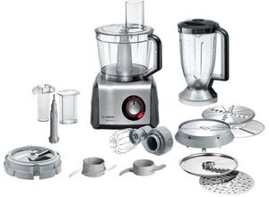 Bosch - EAN: 04242005109340 - Die Kompakt-Küchenmaschine MultiTalent 8 (MC812M844) von Bosch ist vielseitig einsetzbar und trotzdem kompakt. Durch das Feature Smart tool detection werden die Zubehöre automatisch erkannt und der Motor auf die maximale Drehgeschwindigkeit begrenzt. Damit kann man nichts mehr falsch machen. Zudem sorgt die Farbcodierung für einfache und intuitive Montage des Zubehörs. Dank des leistungsstarken 1.250-Watt Motors, der stufenlosen Einstellung der Geschwindigkeit mit Momentstufe sowie der LED-Bedienerführung zaubert man im Nu leckere Gerichte auf den Tisch. Ob Rühren, Kneten, Zerkleinern, Schlagen, Pürieren, Reiben, Raspeln, Mixen oder Schneiden, mit dem vielseitigen Zubehör lassen sich Gerichte schneller und perfekt zubereiten. Auch heiße Suppen, eiskalte Shakes oder Smoothies lassen sich mit dem Mixaufsatz kinderleicht herstellen. Die Reinigung ist ebenso komfortabel, da das Zubehör bequem im Geschirrspüler gereinigt werden kann. - bei alternate.de - aus Yadore Produktdaten Ein leistungsstarkes Modell mit 1250 W, das eine gute Investition für anspruchsvollere Küchenarbeiten darstellt. ![]() Bosch MultiTalent 8 MC812M844