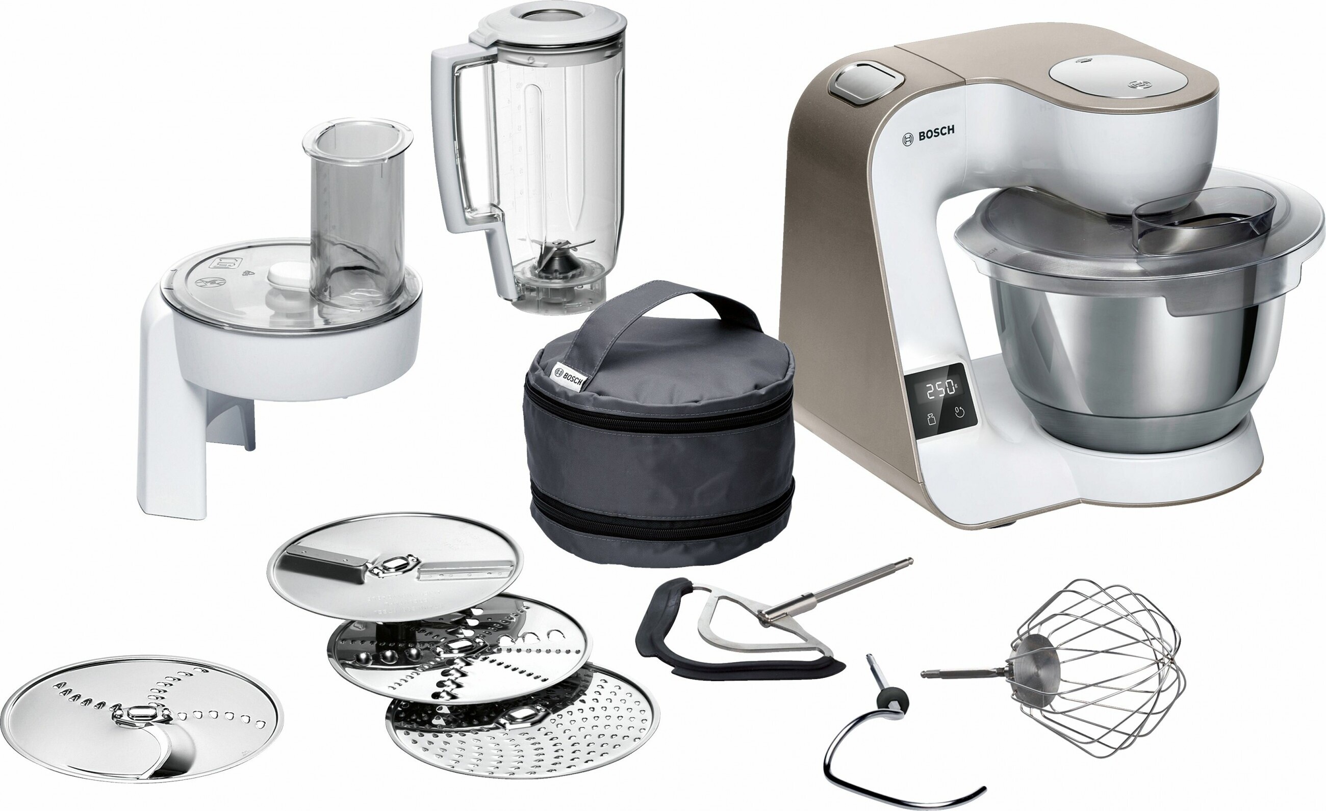 Bosch - EAN: 4242005185207 - Küchenmaschine MUM5 scale ' MUM5XW20'Flexible Küchenmaschine für die Zubereitung verschiedenster Gerichte. Jetzt noch einfacher mit integrierter Waage.Eigenschaften:Perfekte Ergebnisse: kraftvoller 1.000 Watt Motor - erfüllt hohe Ansprüche auch bei schweren Teigen und Kuchenmischungen.Dank der integrierten Waage können alle Rezept-Zutaten direkt in der Schüssel und im Mixer in 5 Gramm-Schritten abgewogen werden.Integrierter Timer: die Verarbeitungszeit immer im Auge behaltenGroße 3,9l Edelstahlschüssel: mit spezieller Innenform für eine optimale Zubereitung der Teige. (bis zu 2,7 kg Rührteig / 1,9 kg Hefeteig)Profi Patisserie-Set: Schnee-, Rührbesen und Knethaken aus Voll-Edelstahl für perfekte Ergebnisse. Mit Kabelaufrollautomatik.Komfort:Easy storage: Kabelaufrollautomatik zur einfachen und schnellen Verstauung des KabelsEasyArmLift: Einfache und kraftsparende Ein-Knopf-Bedienung des multifunktionalen Rührarms mit 3 AntriebsstellenLED-Betriebs- und FehleranzeigeReinigungsfreundlich d - bei kaufland.de - aus Yadore Produktdaten Dieses Angebot von Baur Versand bietet die Küchenmaschine mit integrierter Waage und Durchlaufschnitzler, was eine gute Ausstattung darstellt. ![]() BOSCH Küchenmaschine 'Serie 4 MUM5XW20, integr. Waage, Durchlaufschnitzler, weiß/champagner', weiß (weiß, champagner), B:28cm H:28,2cm T:27,1cm, Küchenmaschinen, 4 Scheiben, Mixer, Edelstahlschüssel, Knethaken/Rühr-/Silikonbesen