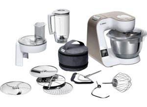 EAN: 4242005185207 - Leistung: 1.000 Watt, 7 Schaltstufen, Momentstufe Max. Füllmenge: 3,9 Liter, (bis zu 2,7 kg Rührteig / 1,9 kg Hefeteig Profi Patisserie-Set: Schnee-, Rührbesen und Knethaken aus Edelstahl Durchlaufschnitzler inkl. 4 Edelstahlscheiben Mixer-Aufsatz Kunststoff 1,25 l - Zubehörtasche Black-Week-Aktion: Angebot gilt nur solange der Vorrat reicht. - bei computeruniverse.net - aus Yadore Produktdaten Ein gutes Angebot von Galaxus, das die Küchenmaschine in Gold und Weiß zu einem fairen Preis anbietet. ![]() Bosch Hausgeräte Serie 4 MUM5XW20, Küchenmaschine, Gold, Weiss