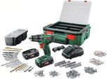 Bosch - EAN: 4053423206272 - Bosch Akku Bohrschrauber PSR 1800 LI-2 18 V, 2x Akku + Systemkoffer ProduktbeschreibungDer Akku Bohrschrauber PSR 1800 LI-2 von Bosch ist dank 18 Volt Technologie besonders kraftvoll und dabei sehr handlich. Die Lithium-Ionen-Technologie sorgt dafür, dass keine Selbstentladung und/oder Memory-Effekt auftreten. Dank der Syneon Chips von Bosch arbeiten Sie immer automatisch im effizientesten Leistungsbereich. Der PSR 1800-LI2 ist mit einem Zweigang Hochleistungsplanetengetriebe ausgestattet - dies heißt perfekte Kraftübertragung bei langer Lebensdauer. Mit den 20+1 Drehmomentstufen des PSR1800 LI-2 kann die Leistung dem Material entsprechend angepasst werden. Das Werkzeug ist dank des Schnellspannbohrfutters innerhalb weniger Sekunden gewechselt. Ausgestattet ist der Bosch Akku Bohrschrauber zudem mit zwei Gängen. Die 18 Volt Akkus aus der Bosch-Familie können auch in anderen 18 Volt Geräten genutzt werden.Geliefert wird der PSR 1800 LI-2 im handlichen Transportkoffer/Systemkoffer. Dieser beinhaltet nicht nur das Bosch Gerät selbst, sondern noch eine Vielzahl von Zubehör. Ob Schrauben, Dübel oder Bohrer - in diesem Set finden Sie alles was ein Heimwerker benötigt.Technische DatenSpannung18 VAkku-TypLi-IonDrehmomentstufen20+1Max. Schrauben8 mmMax. Bohren Holz30 mmMax. Stahl1 mmLeerlaufdrehzahl (1. / 2.Gang)0-400 / 0-1350 min-1Drehmoment weich18 NmDrehmoment hart38 NmAnzahl Gänge2Gewicht ca.1,2 kgLadezeit der mitgelieferten Akkusca. 60 ... Ein weiteres attraktives Komplettset mit Akku-Bohrschrauber, zwei Akkus und viel Zubehör in einer praktischen SystemBox. ![]() ![]() Bosch Akku Bohrschrauber PSR 1800 Li-2 (2 Akkus, 18 V System, 241-teiliges Zubehörset, in SystemBox)
