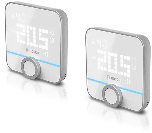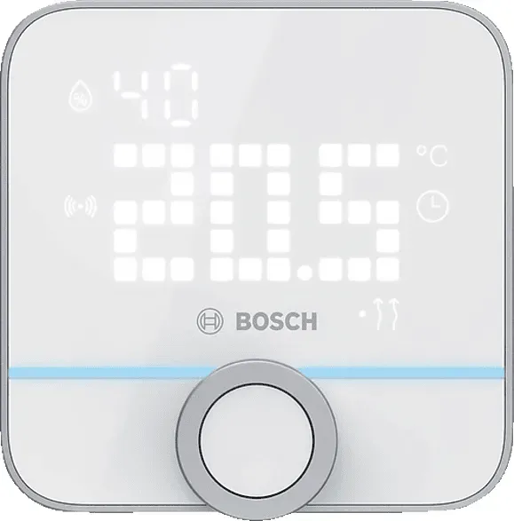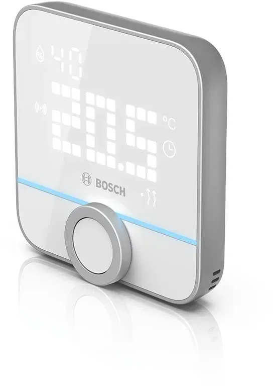Kategorie: Zubehör für Klima & Heizen - Bosch - GTIN:4062321608057 - Bosch Smart Home Raumthermostat II 230 V (Fußbodenheizung) Sie möchten Ihre Gastherme oder wasserführende Fußbodenheizung smart machen? Das Raumthermostat II 230 V ist die smarte Lösung für alle Heizsysteme mit kabelgebundener Steuerung! Heiztherme & Fußbodenheizung smart machen Das Raumthermostat II 230 V steuert Fußbodenheizung, Gastherme, Heizkörper-Thermostate und andere kabelgebundenen Heizsysteme smart und effizient. Stets Temperatur & Heizstatus ablesen Dabei zeigt das Raumthermostat II 230 V stets die aktuelle Raumtemperatur an und signalisiert ausgeführte Aktionen via mehrfahrigem LED-Leuchtstreifen.Der mehrfarbige LED-Leuchtstreifen auf dem automatisch aufleuchtenden LED-Matrix-Display signalisiert ausgeführte Aktionen visuell. Dabei können Sie die Helligkeit und Einschaltdauer des Displays nach Ihren Wünschen einstellen. Im Sommer Heizpausen einlegen und per Fußbodenheizung kühlen. (Fußboden-)Heizung flexibel steuern Die Fußbodenheizungs-Steuerung ist vielfältig: Von klassisch am Gerätper Dreh- und Drückknopf bis vollautomatisiert, über Zeitprogramme, per Sprachassistent und natürlich mobil per App. Luftfeuchtigkeit messen und regulieren Das Raumthermostat II 230 V misst auch die relative Luftfeuchtigkeit im Raum und warnt Sie visuell, wenn die Luftfeuchte außerhalb der gesunden Grenzwerte ist. So genießen Sie ein gesundes Raumklima und vermeiden Schimmelbildung. Der bunte LED-Streifen auf dem ... Dieses Thermostat ist speziell für FuÃ?bodenheizungen konzipiert und bietet eine gute Preis-Leistung. ![]() Bosch Smart Home Fußbodenheizung 230V Raumthermostat II