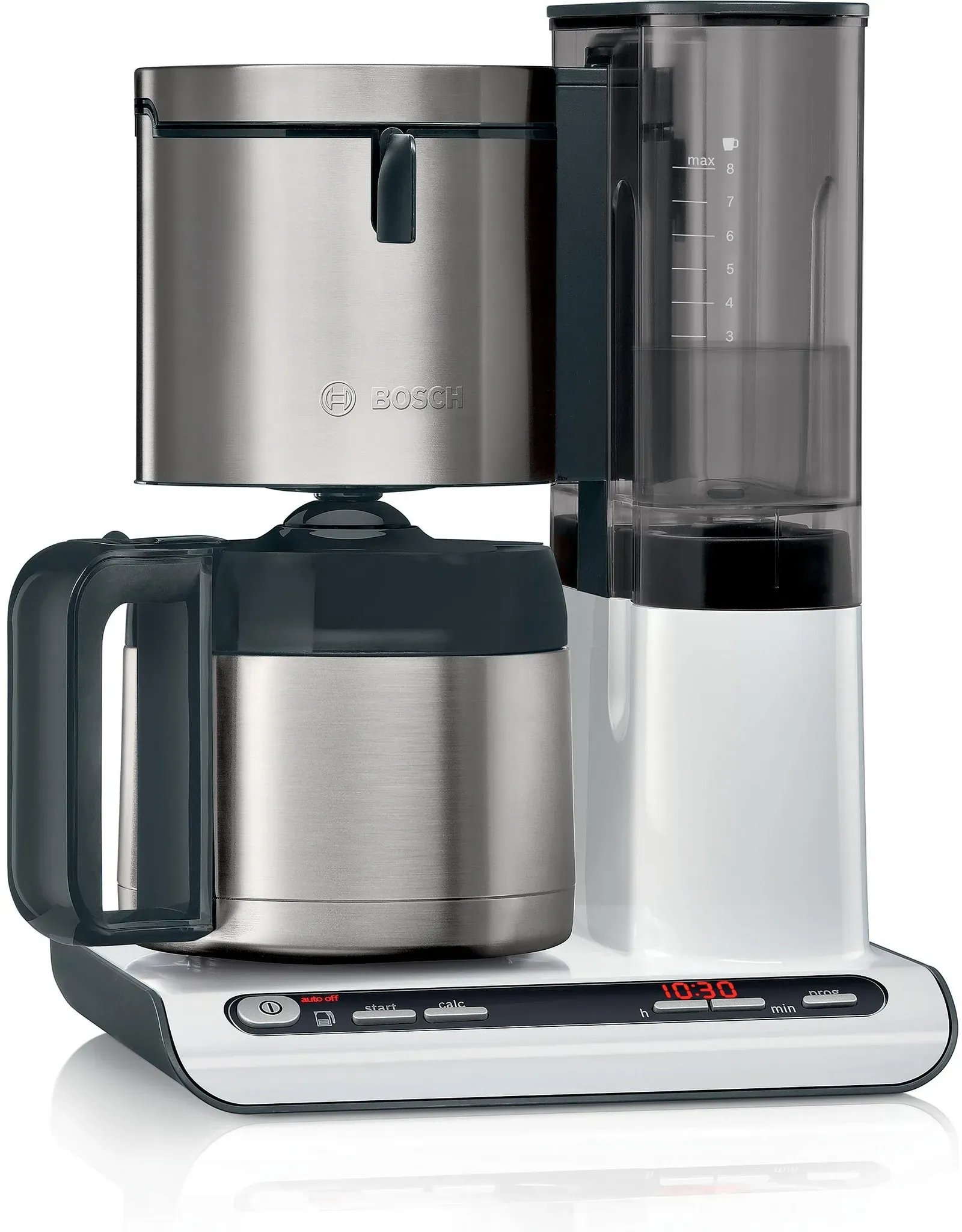 Zustand: Neu - Filterkaffeemaschinen - Bosch Hausgeräte - TKA8A681 - EAN: 4242005216369 - Kraftvolles Heizsystem: ideale Brühtemperatur für volles Aroma, Thermokanne für längeren Genuss Aroma Sensor: optimales Brühen auch bei kleinen Mengen †Brühzeit wird automatisch angepasst Abnehmbarer Wassertank: einfach und schnell direkt unter dem Wasserhahn zu befüllen Timer: aufwachen zum Geruch von frischem Kaffee. Brühen startet automatisch zur ausgewählten Zeit Edelstahl-Thermokanne: doppelwandige Kanne für längeren Genuss von aromatischem, heißem Kaffee - Verkäufer: Aximax im amazon.de Marketplace ![]() ![]() Bosch Filterkaffeemaschine Styline TKA8A681, Aroma Sensor, Edelstahl-Thermokanne 1,1 L, Für 8-12 Tassen, Abschaltautomatik, Entkalkungssystem, Tropfstopp, Abnehmbarer Wassertank (1 L), 1100 W, Weiß
