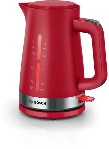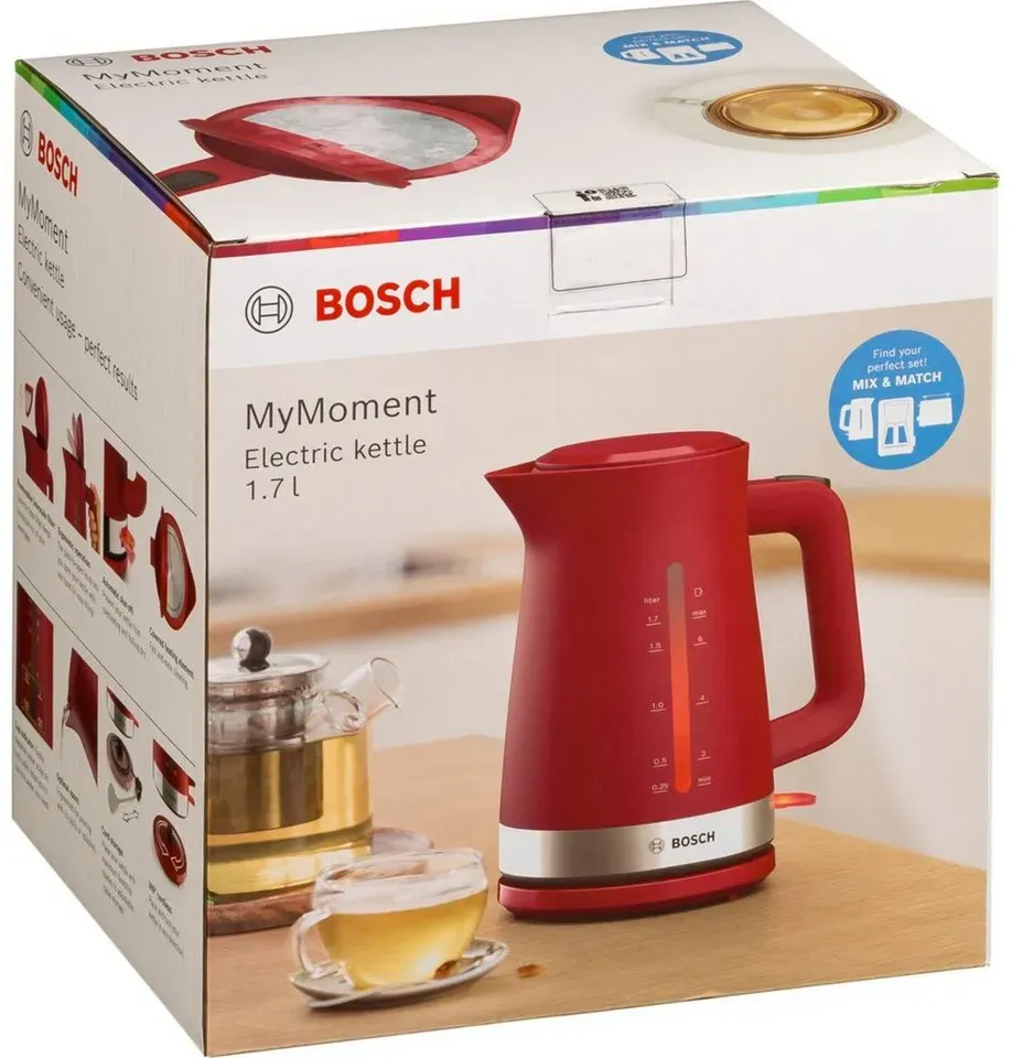 Auf Lager Versand durch AmazonBosch kabelloser Wasserkocher MyMoment TWK2M164, Abschaltautomatik, Überhitzungsschutz, Tassenanzeige, entnehmbarer Kalkfilter, Trockengehschutz, Dampfstopp-Automatik, 1,7 L, 2400 W, Rot matt