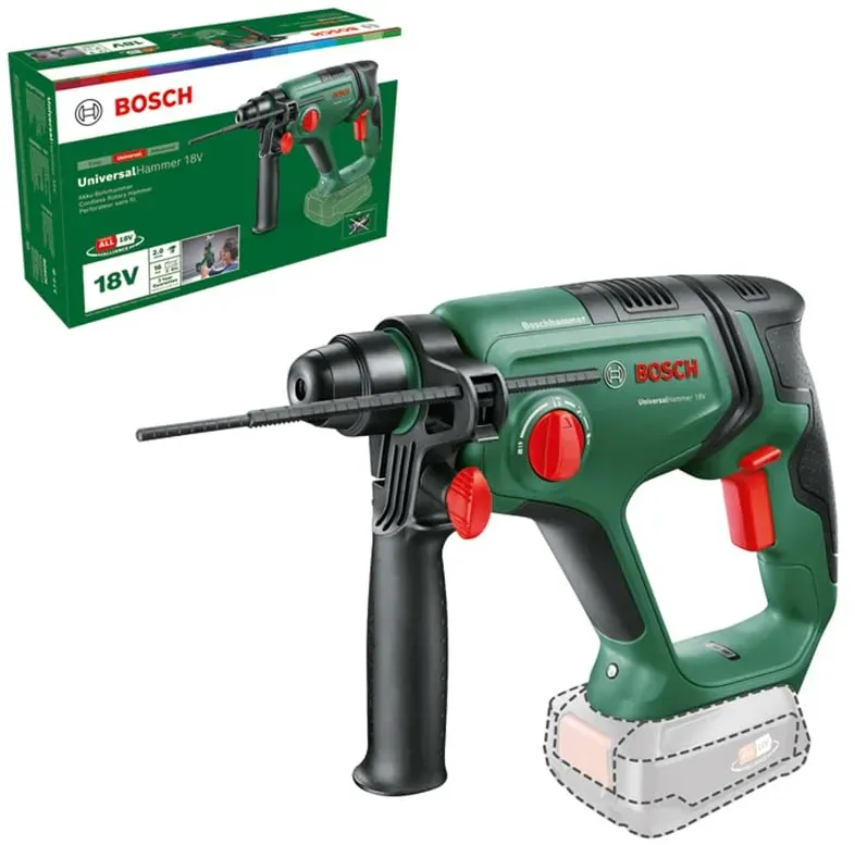 Zustand: Gebraucht - Bohrhämmer - Bosch - 06039D6001 - EAN: 4053423233322 - Kompaktes, handliches Design für beeindruckende 4-in-1-Leistung Pneumatisches Hammerwerk mit 2,0 J zum Bohren bis 16 mm Durchmesser und Meißeln in Beton SDS plus-Universalbohrfutter für einen leichten, werkzeuglosen Wechsel von Bohrern und Meißeln Vibration Control und Rotation Control sorgen für eine sicherere Handhabung und geringere Ermüdung Lieferumfang: Tiefenanschlag;Zusatzhandgriff;Rundschaftadapter;Karton - 2 Händler im amazon.de Marketplace Ein solides Basismodell ohne Akku, das eine gute Balance zwischen Preis und Leistung bietet. ![]() ![]() Bosch Akku-Bohrhammer UniversalHammer 18V (ohne Akku; 18 Volt System; Bohren/ Hammerbohren/ Meißeln; 2,0 J Schlagenergie; SDS plus Werkzeugaufnahme; im Karton)