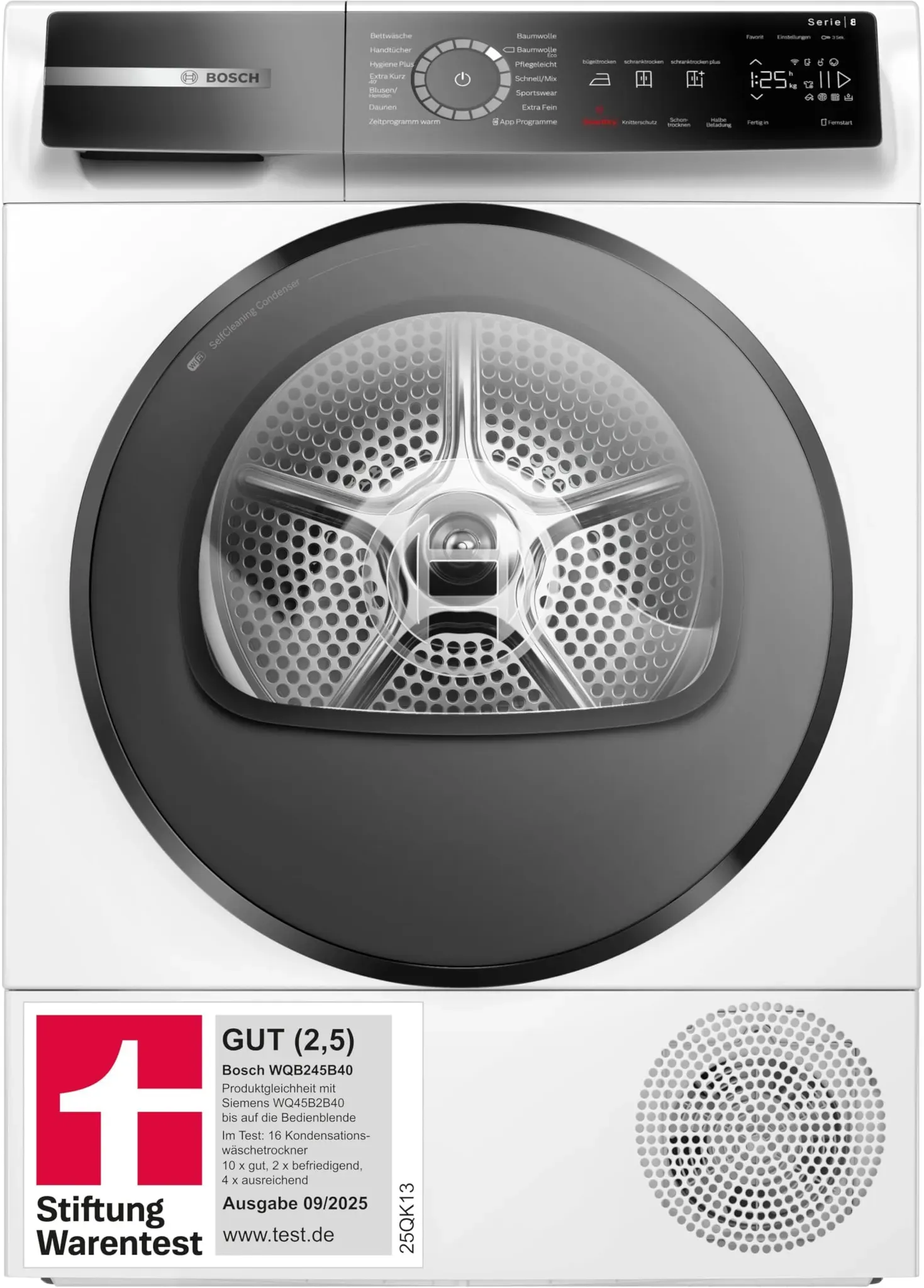 29 Händlerangebote bei billiger.de - Kategorie: Wärmepumpentrockner - Bosch - Von der Stiftung Warentest als GUT mit der Note 2,5 ausgezeichnet (Ausgabe 09/2025), Lizenz-Nummer 25QK13, im Test: 16 Kondensationswäschetrockner, 10x gut, 2x, befriedigend, 4x ausreichend) Selbstreinigender Kondensator: Reinigt sich während des Trocknens automatisch bis zu viermal, bleibt dauerhaft flusenfrei und sorgt so für gleichbleibend hohe Energieeffizienz Auto Dry: Intelligente Sensoren messen Temperatur und Feuchtigkeit, stoppen den Trocknungsprozess rechtzeitig und liefern ideal bügelfeuchte, schranktrockene oder extratrockene Wäsche Smart Dry: Waschmaschine und Trockner kommunizieren direkt miteinander und wählen automatisch das optimale Trockenprogramm €“ für optimale Ergebnisse ohne zusätzlichen Aufwand Smart Start: Startzeit automatisch optimieren €“ nutzt Strom dann, wenn er am günstigsten oder am umweltfreundlichsten ist, für effizienten Betrieb und nachhaltige Ergebnisse - GTIN:4242005364275 ![]() ![]() Bosch Serie - 8 WQB245B40 eBay Wärmepumpentrockner 9kg HomeConnect selfCleaning AutoDry