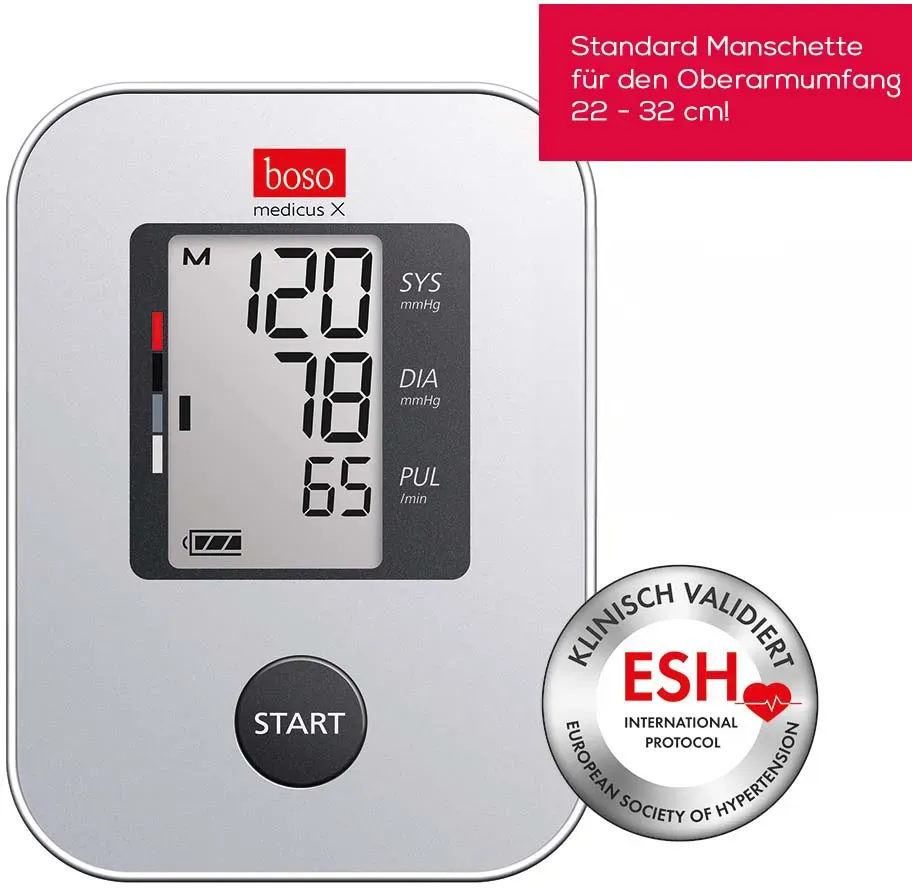 BOSCH & SOHN - EAN: 4002427004773 - Der 'Medicus X' ist Ihr zuverlässiger Partner für präzises Blutdruckmessen am Oberarm. Klinisch validiert nach ESH, bietet er eine Mittelwertfunktion zur Beurteilung des Blutdrucks nach WHO-Standards. Dieses Gerät erkennt Herzrhythmusstörungen, darunter Vorhofflimmern, und warnt Sie frühzeitig. Mit einer Speicherkapazität von 30 Messwerten ermöglicht es die Erstellung eines 14-Tage-Profils. Die Manschette passt für Armumfänge von 22 bis 32 cm, und die intelligente Aufpumpautomatik sorgt für eine reibungslose Messung ohne Nachpumpen. Der 'Medicus X' wird mit Alkaline-Batterien geliefert und verfügt über eine Qualitäts von n. Einfache Anwendung und viele Funktionen machen den 'Medicus X' zur idealen Wahl für Ihre Blutdrucküberwachung. - bei moderne-hausfrau.de - aus Yadore Produktdaten ![]() ![]() Boso Medicus - X Oberarm eBay Blutdruckmessgerät Digital Blutdruck Monitor Pulsmessung